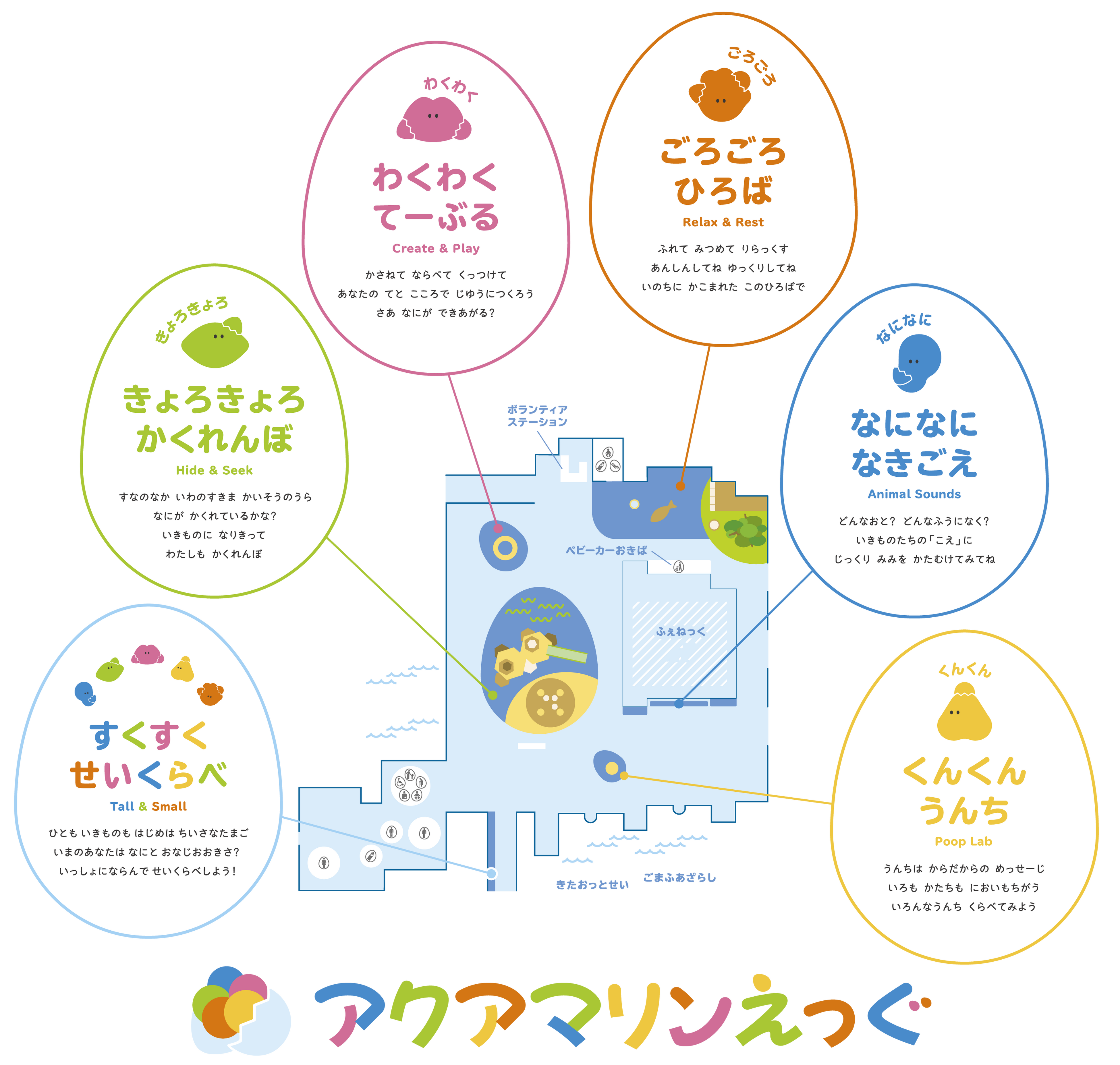 新しい「アクアマリンえっぐ」は、 「あそび」と「まなび」がちりばめられた6つのゾーンが広がり、五感を使って生き物たちの生きる工夫「いのちのアイデア」を体験できる幼い子どもたち向けのコーナーです。本コーナーには、以下の2つの特徴があります。