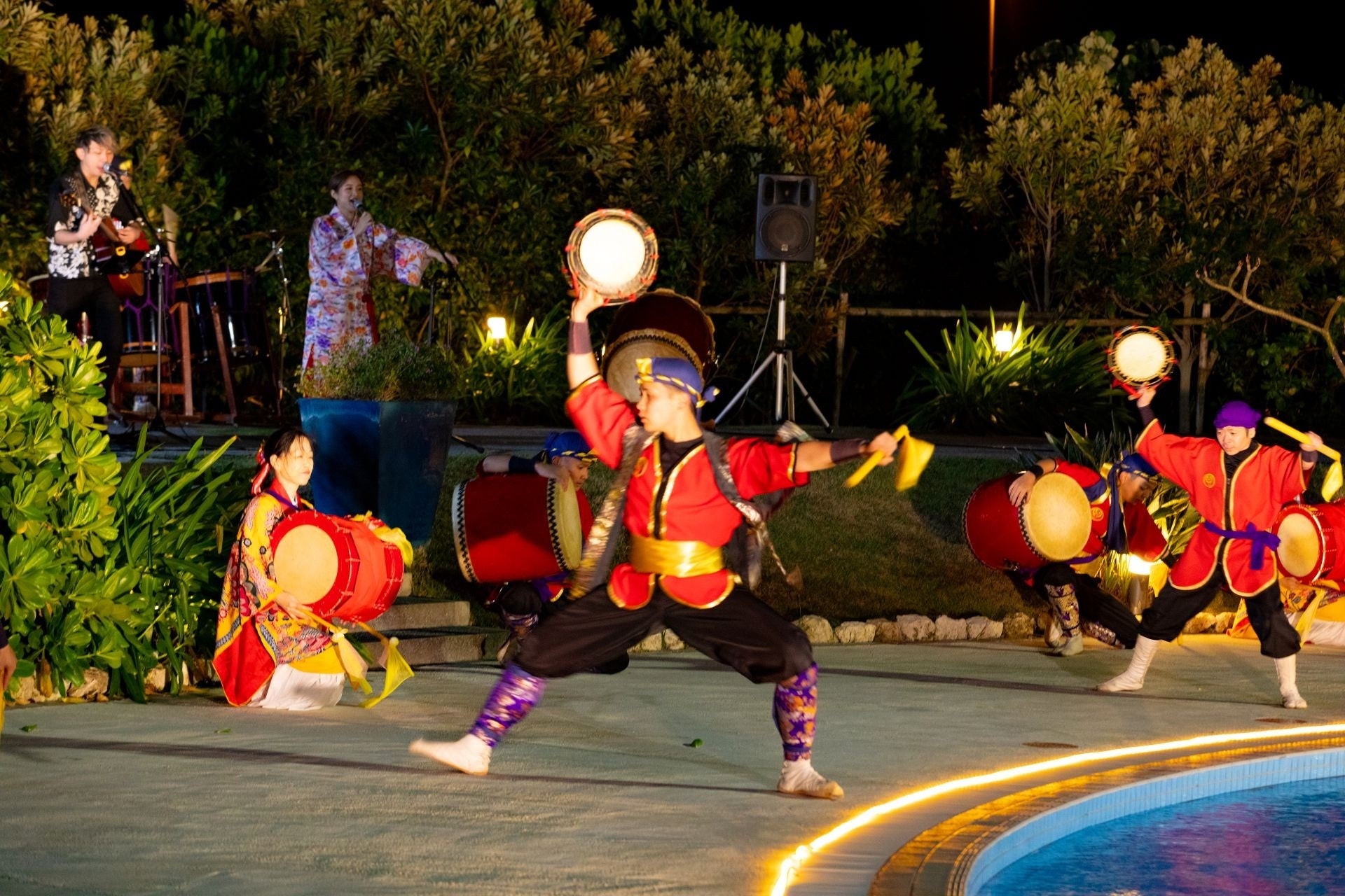 沖縄の心地よい夜風が吹き抜けるガーデンプールサイドを舞台に、エイサー演舞や三線の音色など、沖縄の伝統文化を楽しめるライブパフォーマンスをお届けします。南国の夜空の下、沖縄ならではの文化と音楽に触れる特別なひとときをお楽しみいただけます。