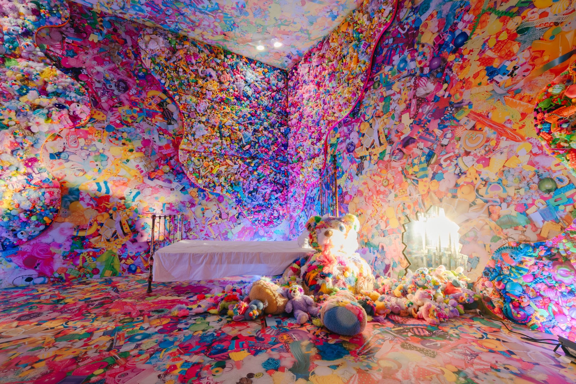 会場内は時計回りに6つの部屋を巡っていく構成です。中でも6の部屋「Colorful Rebellion – Seventh Nightmare – 」は、12 年前のニューヨークで誕生した代表作で、「自分にとってKAWAIIとはなにか」などと思い悩んだ風景を作品にしたと述べます。