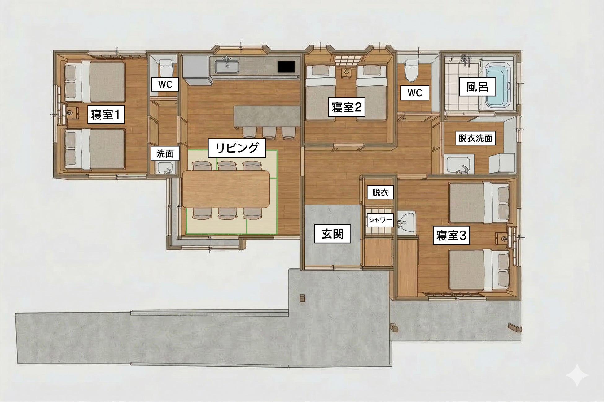三世代の家族旅行や友人グループ、学生合宿でも「全員が同じ部屋」で団らんの時間を過ごせます。ゆったりとした「浴室」とは別に「シャワールーム」を完備。さらに「洗面台」も3箇所に設けているため、朝の身支度や夜のバスタイムも混雑せず、ストレスフリーにお過ごしいただけます。