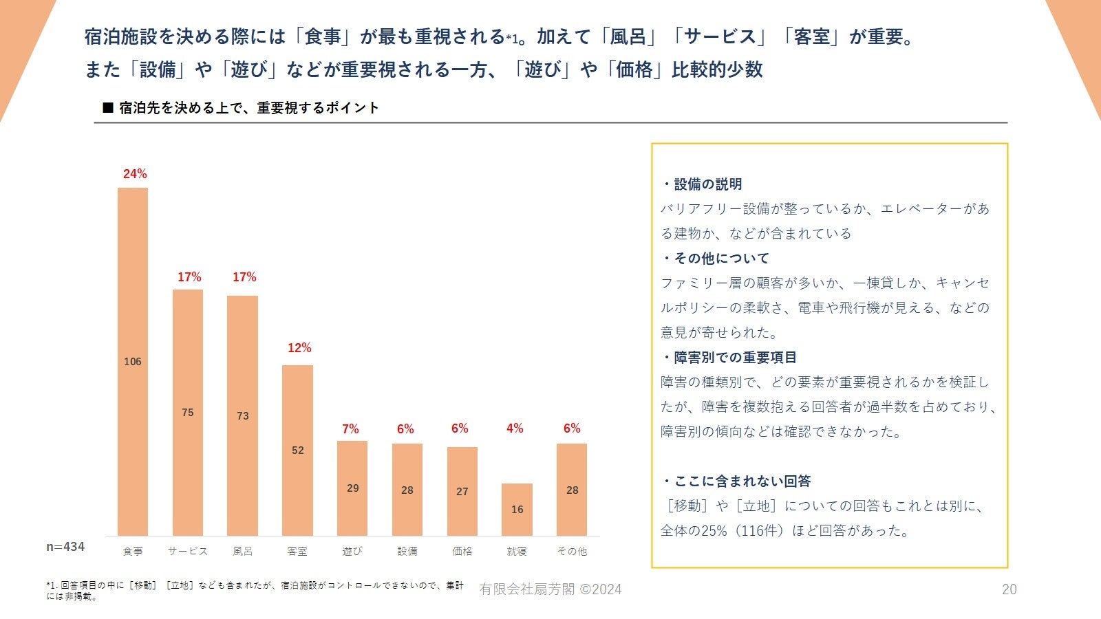 宿泊施設を選ぶ際に最も重視されるのは「食事」で、偏食対応や子どもメニューへの関心が高い