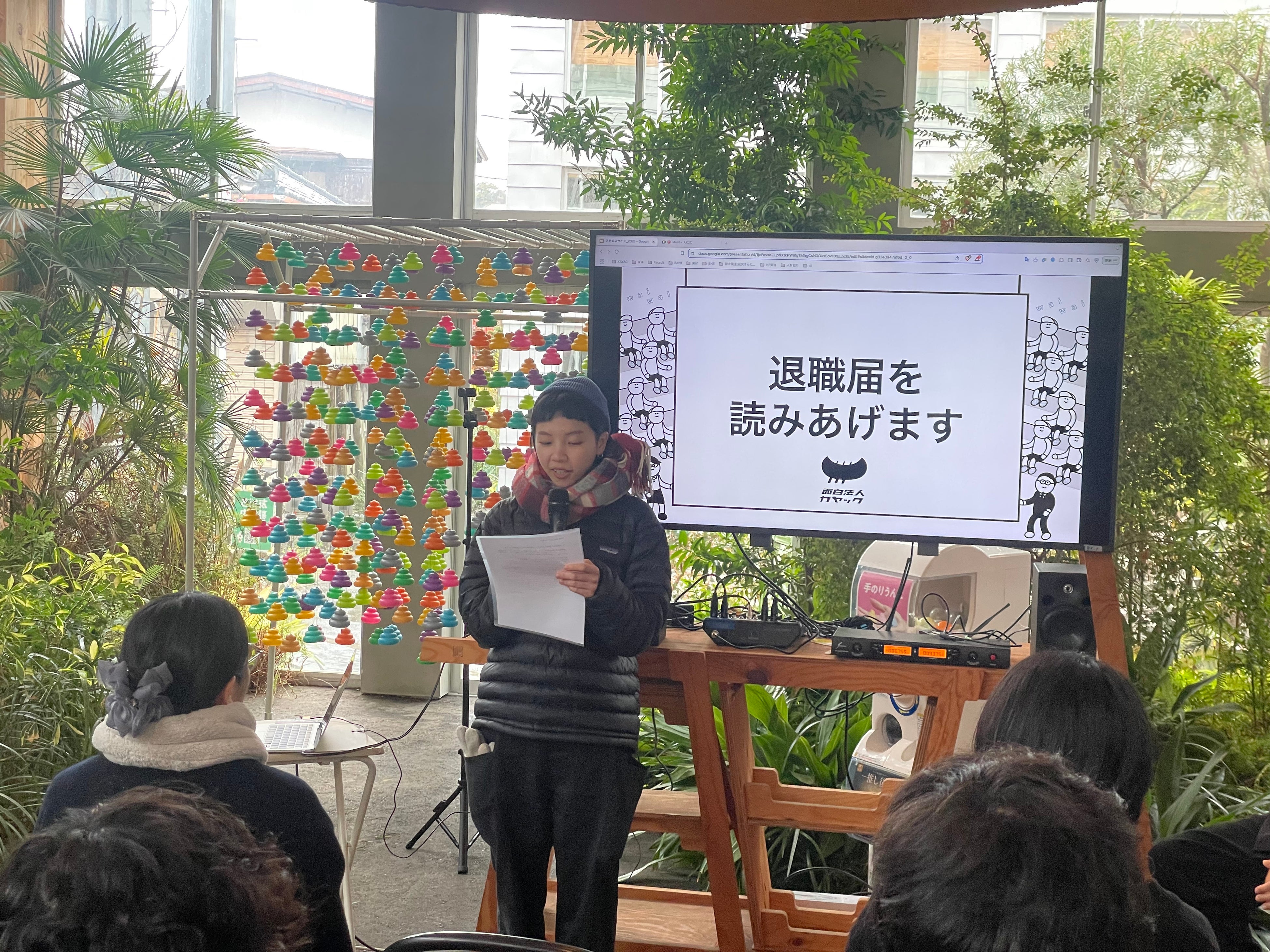 新入社員代表挨拶として「退職届」を読み上げる、カヤック恒例の入社式