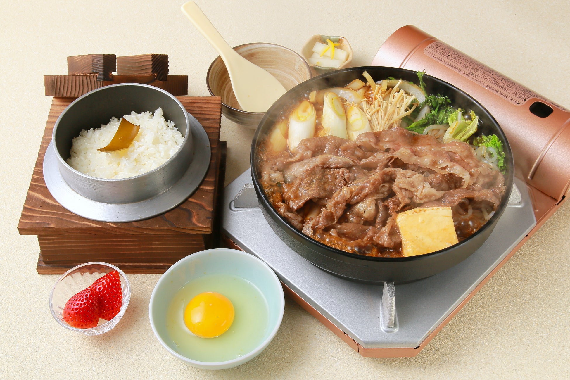 本コースは、池袋駅東口を出発し、群馬県桐生市にある駅直結の滞在型リゾート『駅の天然温泉&サウナの森 水沼ヴィレッジ』で、国産牛のすき焼御膳の昼食をお召し上がりいただきます。食後は、リゾート内の『駅の天然温泉 水沼の湯』でゆったりと天然温泉を満喫。旅の締めくくりには、栃木県で旬のいちご狩り(食べ放題)を楽しめる、春のおでかけにぴったりの日帰りツアーです。