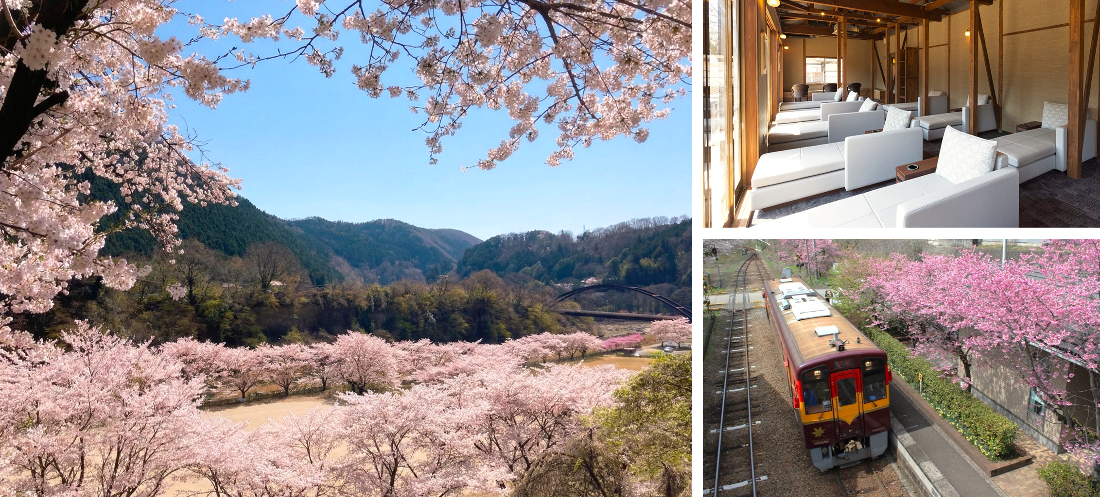 さらに、館内から駅のホームに一歩足を踏み出すと、わたらせ渓谷鐵道の沿線に続く桜並木の美しい風景が広がります。タイミングが合えば、桜並木と列車が並ぶ、この季節ならではの景観もお楽しみいただけます。