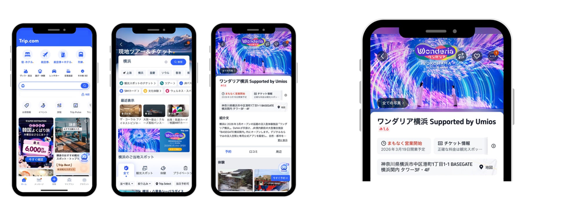 今回のワンダリア横浜の電子入館チケット販売もその一環であり、横浜を訪れる国内外の旅行者に対して、宿泊や交通と組み合わせた新たな観光体験の提案を可能にします。Trip.comで購入した電子入館チケットはアプリ上で一元管理でき、当日はスムーズな入場が可能です。また、Trip.comのアプリは多言語対応のため、訪日外国人旅行者にも利用しやすい環境を整えています。