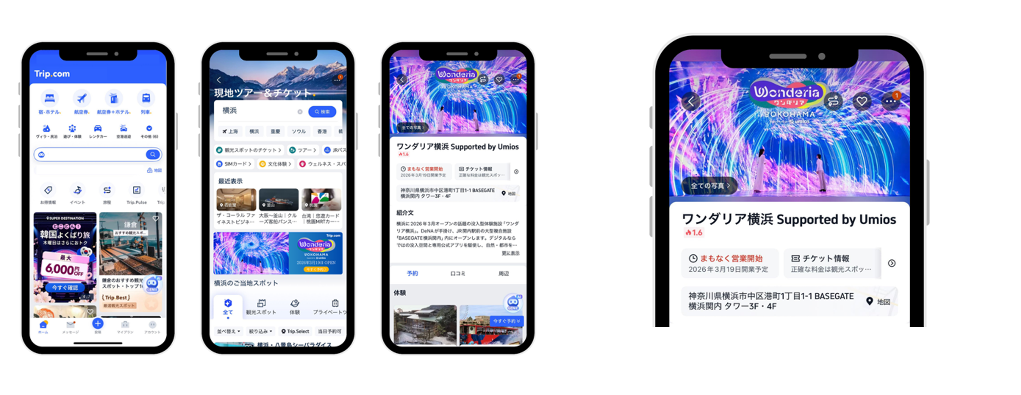 今回のワンダリア横浜の電子入館チケット販売もその一環であり、横浜を訪れる国内外の旅行者に対して、宿泊や交通と組み合わせた新たな観光体験の提案を可能にします。Trip.comで購入した電子入館チケットはアプリ上で一元管理でき、当日はスムーズな入場が可能です。また、Trip.comのアプリは多言語対応のため、訪日外国人旅行者にも利用しやすい環境を整えています。
