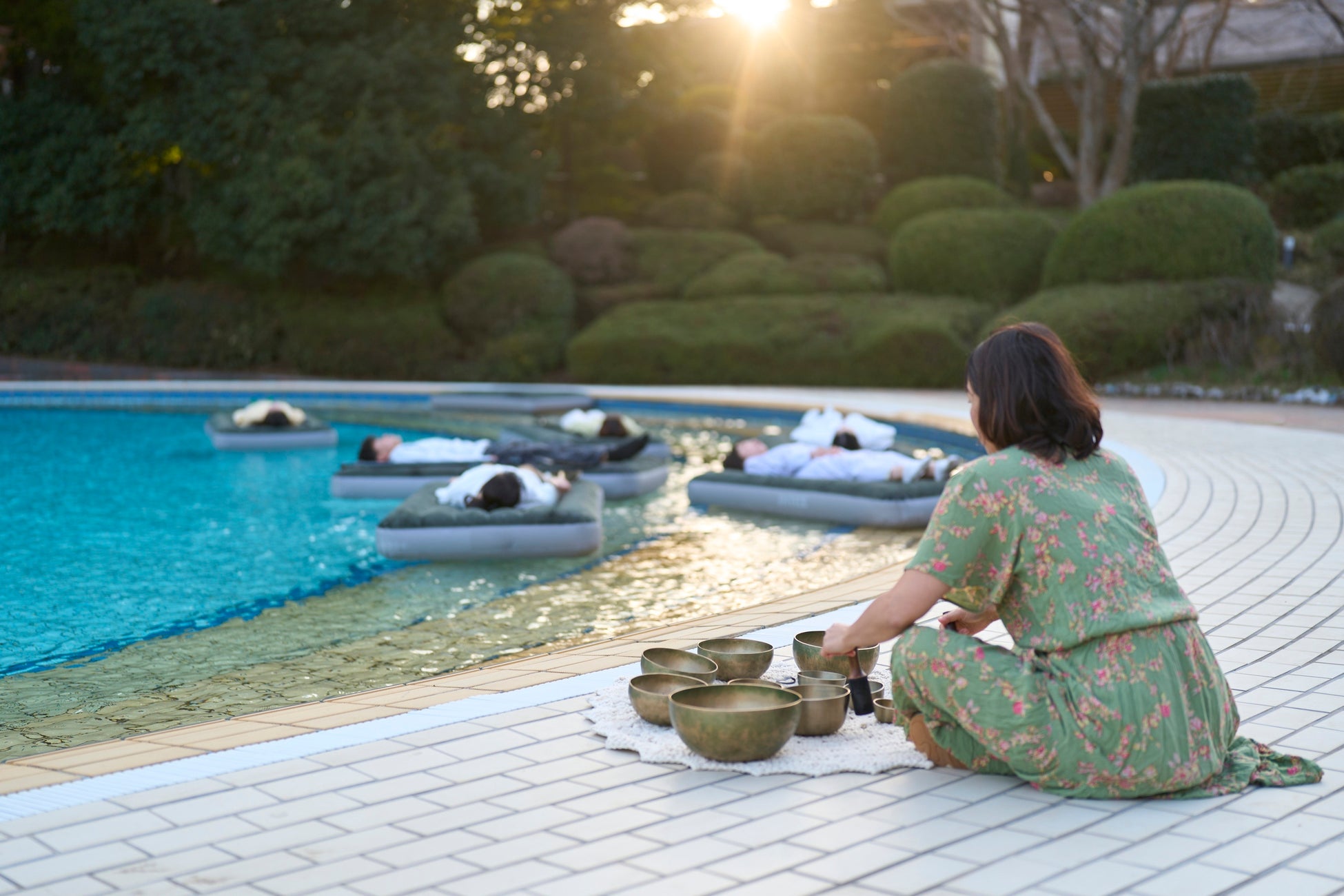 水上ベッドに身をゆだね浮遊しながら音を浴びるウェルネス体験「Floating Sound Bath(フローティング サウンド バス)」を開催いたします。全⻑130mのリゾートプールに浮かぶ水上ベッドに寝ころび、自然の音とシンギングボウルが奏でる音色に包まれて心と身体を整えるウェルネス体験です。
