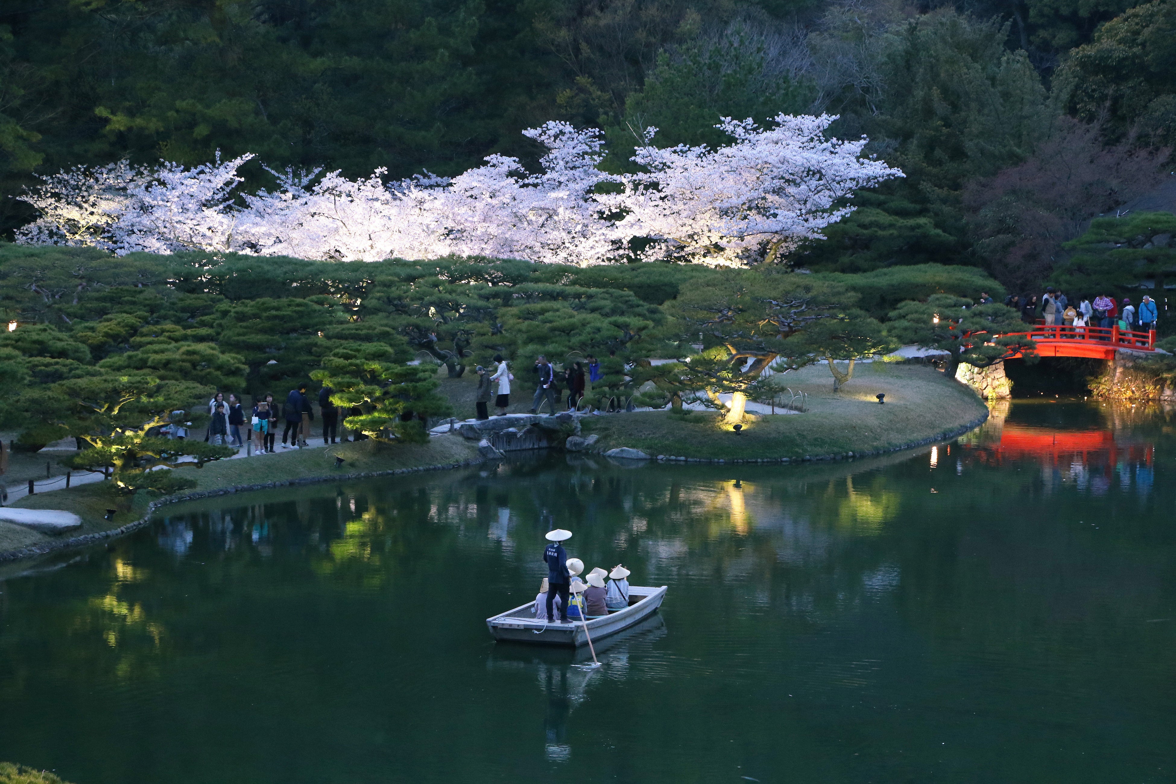 ライトアップ期間中は、夜桜を水上から楽しめる和船の特別周遊や、香川の伝統工芸の一つ“讃岐提灯”の灯りによる幻想的な演出(土日限定レンタル)、さらに和太鼓や邦楽演奏など春の宵を彩る催しも予定しています。歴史ある庭園と伝統文化が響き合う特別な夜をお楽しみいただけます。