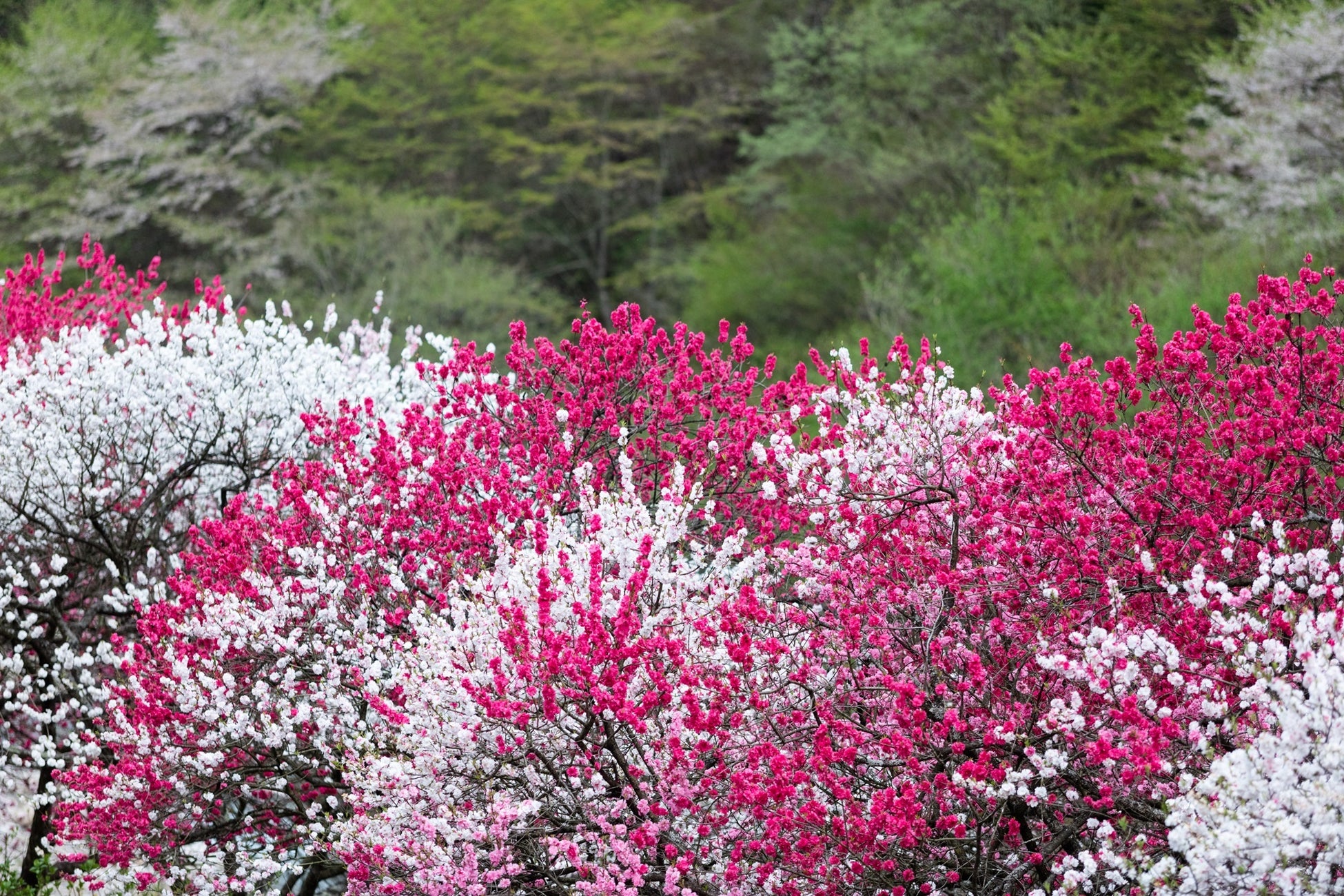 阿智村では、4月中旬から5月上旬にかけて、花桃が見頃をむかえ、約10,000本の赤、白、ピンク色の3色の花が咲き誇ります。