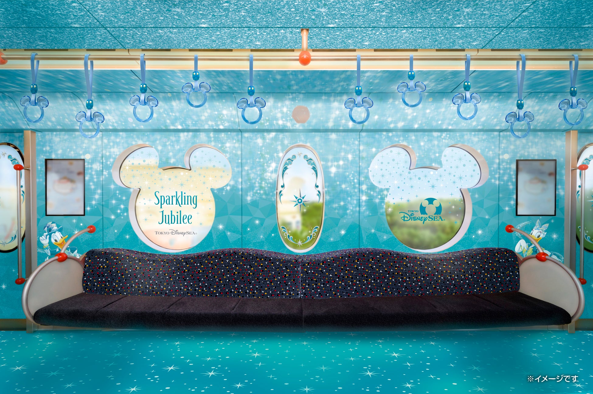 東京ディズニーシー25周年の衣装を身にまとったミッキーマウスと仲間たちが描かれた、東京ディズニーシー25周年を記念した期間限定デザインのラッピングモノレール。車内はジュビリーブルーをベースにキャラクターや華やかな装飾で彩られ、つり革も25周年仕様のデザインに変わり、車内はきらめきであふれます。