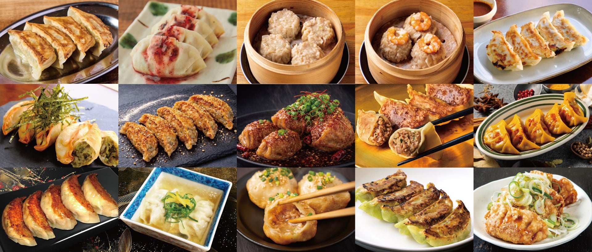▶︎GYOZA【餃子とワイン 果皮と餡】:旨味溢れるコリコリ牛タン餃子、バター醤油の揚げトウモロコシ餃子/【餃子の宮でんでん】:チーズのせ爆汁丸餃子、小江戸黒豚こく味羽根付き餃子/【貝汁ぎょうざ専門 SHELL☆Bom】:貝汁ぎょうざ、青唐辛子貝汁ぎょうざ/【じゃげな】:信州わさびビーフ餃子、信州味噌タレねぎ餃子/【蒸キゲン~jokigen~】:蒸キゲン肉焼売、海老ぷり焼売/【エンジェル餃子】:コリコリ味噌だれホルモン餃子、磯香る!有明のりしお餃子/【玉川精肉店】:黒毛和牛100% あらびき和牛餃子、ゴロゴロお肉のキーマカレー餃子/【京都餃子enen】:塩バタートリュフ餃子、パリッと薄皮!祇園ガーリック餃子/【大衆ぎょうざ倶楽部 餃夢中】:三河もち豚餃子 羅臼昆布謹製たれ、鶏軟骨入り餃子 紀州梅肉ソース/【香港点心楼】:カニあんかけ海老餃子、贅沢フカヒレ蒸し餃子/【餃子専門店 餃子チョップ】:名物焼きあげ餃子、四川麻婆焼きあげ餃子/【鴨料理専門店 オペレッタ52】:ペペロンチーノ鴨ネギ餃子、旨辛!トマトアラビアータ鴨餃子/【京都餃子ミヤコパンダ】:さわやかに香るレモン餃子、白酢味噌仕立の九条ねぎだく京餃子/【なかよし餃子エリザベス】:極上手包み焼き小籠包/【博多八助】:博多ひとくち餃子、明太チーズ餃子/【宇都宮餃子はちまん餃子】:肉汁爆発餃子、大葉香るおろしポン酢餃子/【肉玉そば越智×浅草開化楼】:謹製 旨味肉汁餃子、本枯れ節と真昆布のスープ 生姜餃子