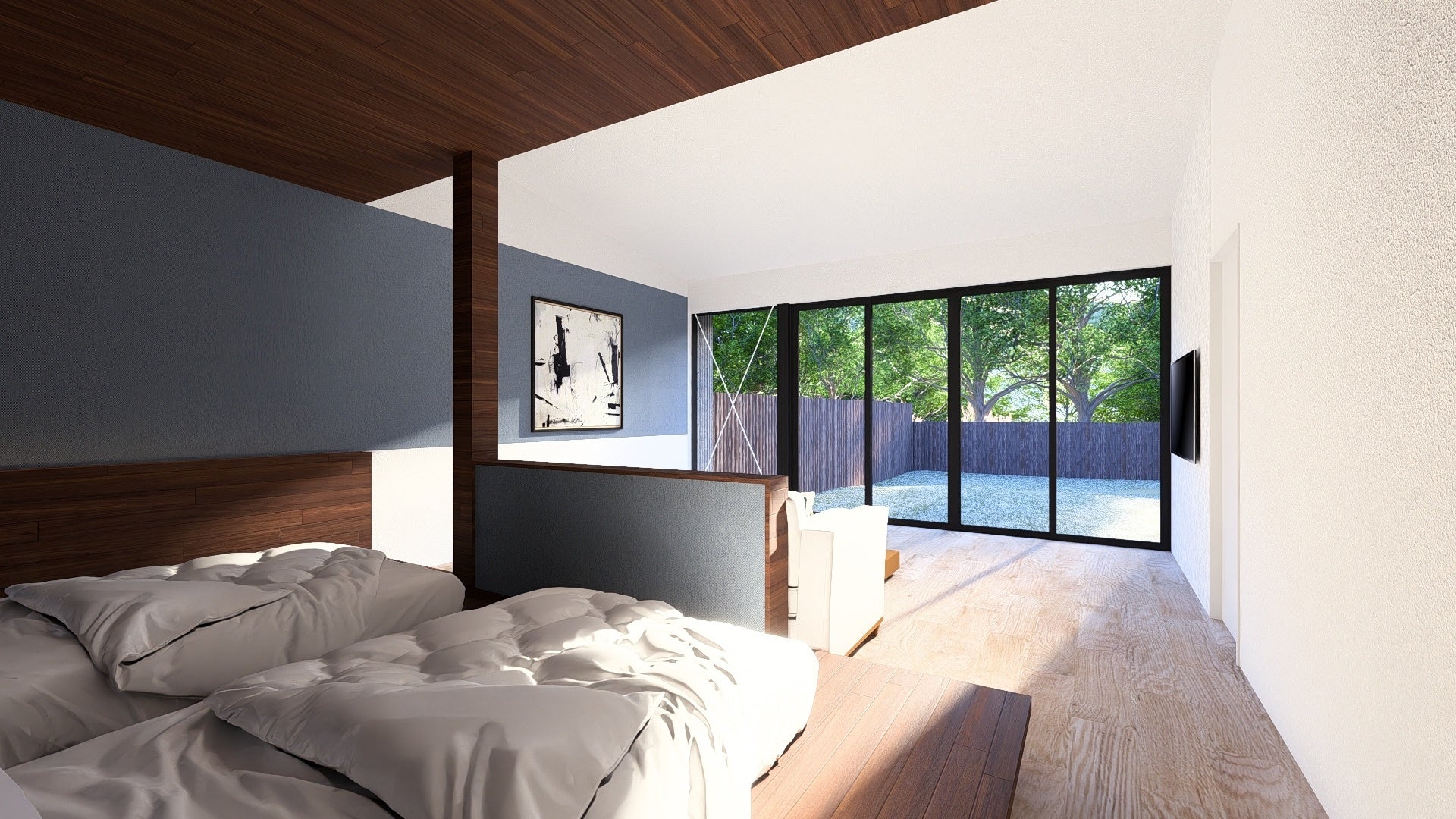 客室は、1棟4室の平屋設計。各室の室内面積は70㎡を確保し、モダンで落ち着きのあるリビングと寝室を備えています。さらに、各客室から直接出入りできる70㎡の専用ドッグランを完備。大型犬ものびのびと走り回れる広さを実現しました。