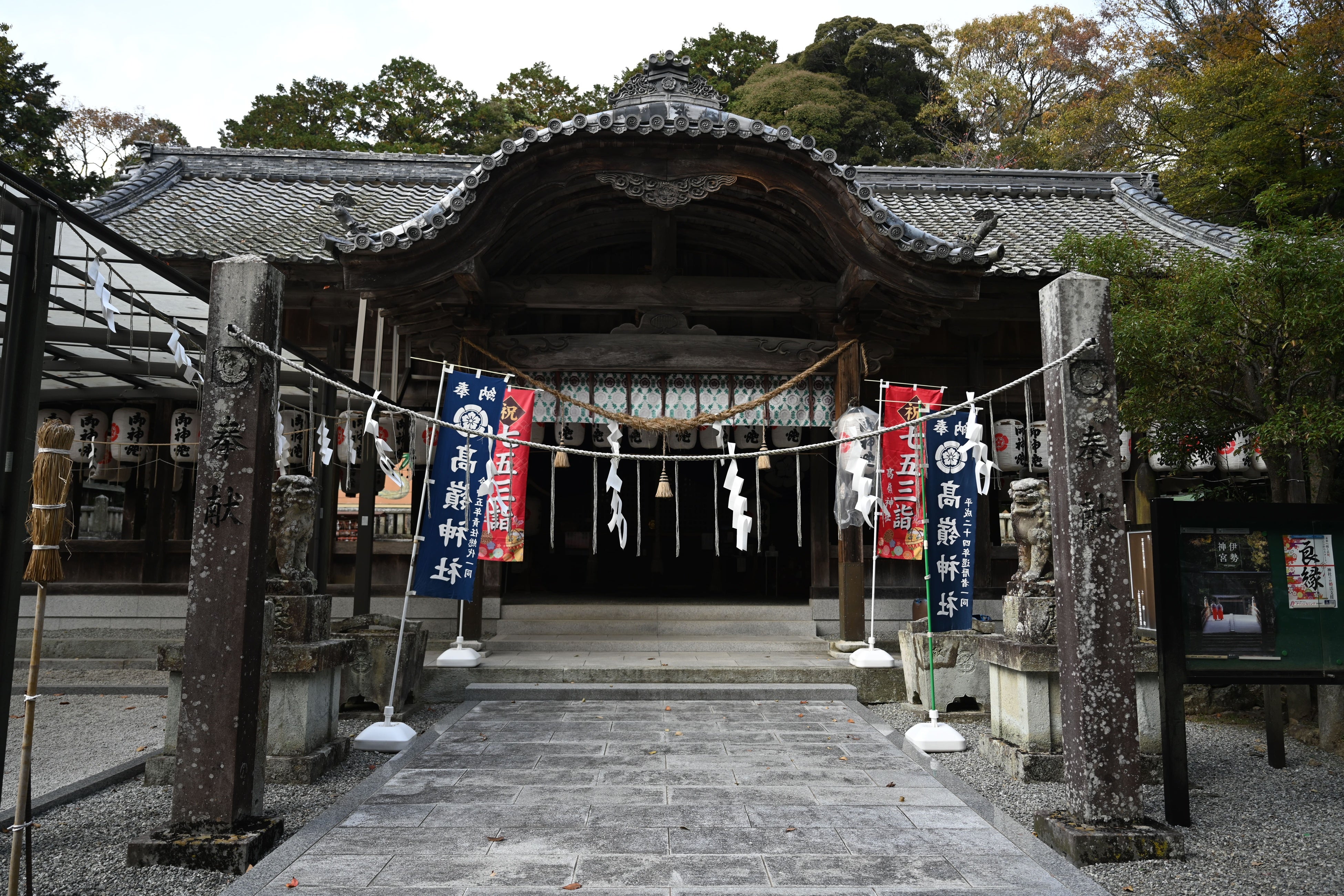 主祭神『須佐之男命(すさのおのみこと)』を祀る拝殿で、ぬいぐるみも参拝者の一員として丁寧にご祈祷を受けます。 敷地内には、巨大な「千年杉」がそびえ立ちます。静謐な空気の中で、日常を忘れてリフレッシュするひとときを過ごせます。ご祈祷後には、歴史ある境内での撮影会も実施。上郡町の人気ゆるキャラ「円心くん」が登場する特別な時間も用意されています。