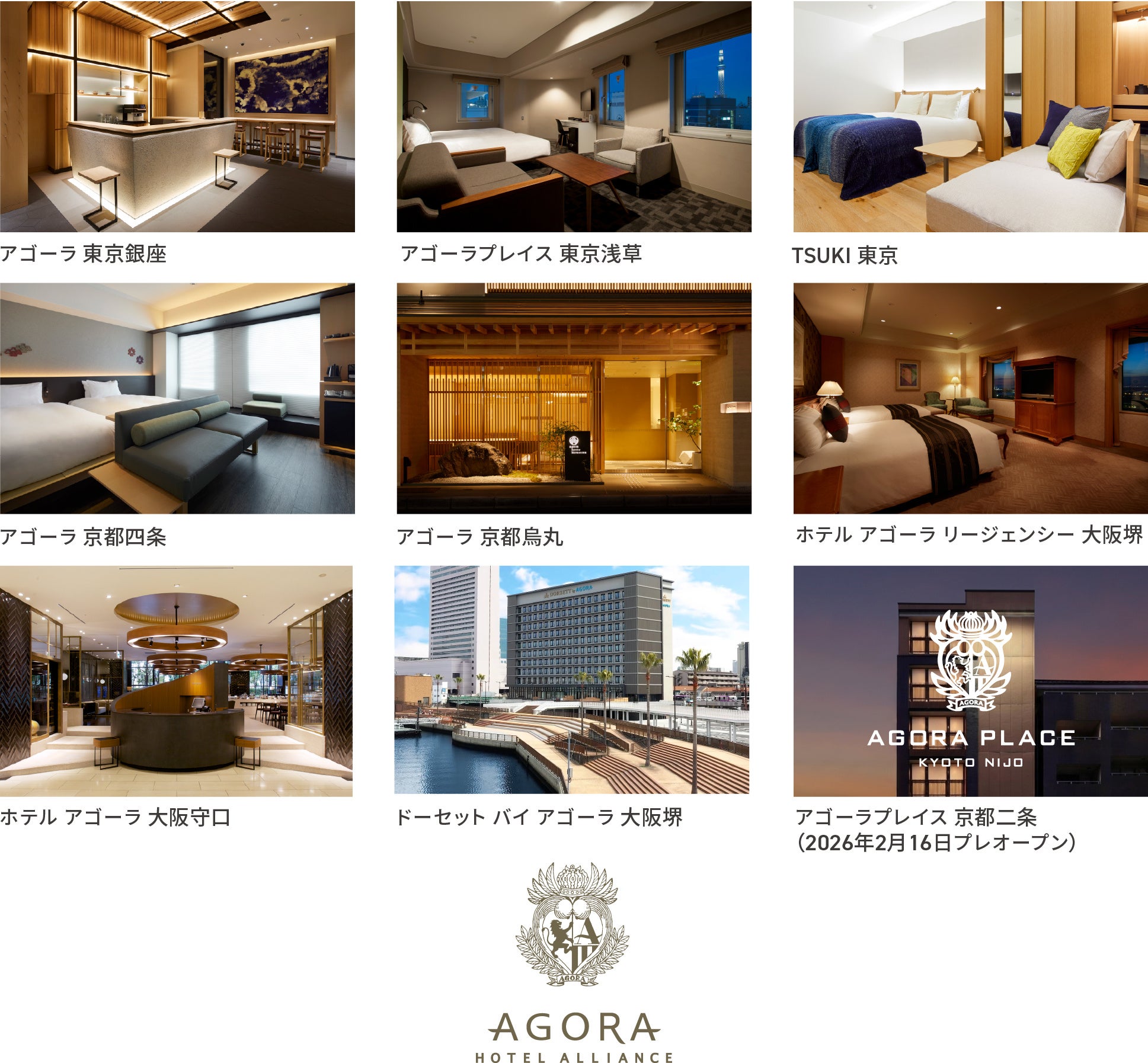 アゴーラ ホスピタリティーズは、「美しい日本を集めたホテルアライアンス」をビジョンに掲げ、お客様の期待を超える最高の場所を提供するとともに、地域に貢献できる「街の自慢」となるホテルの創出を目指します。全国で9施設、客室数1,260室を展開。