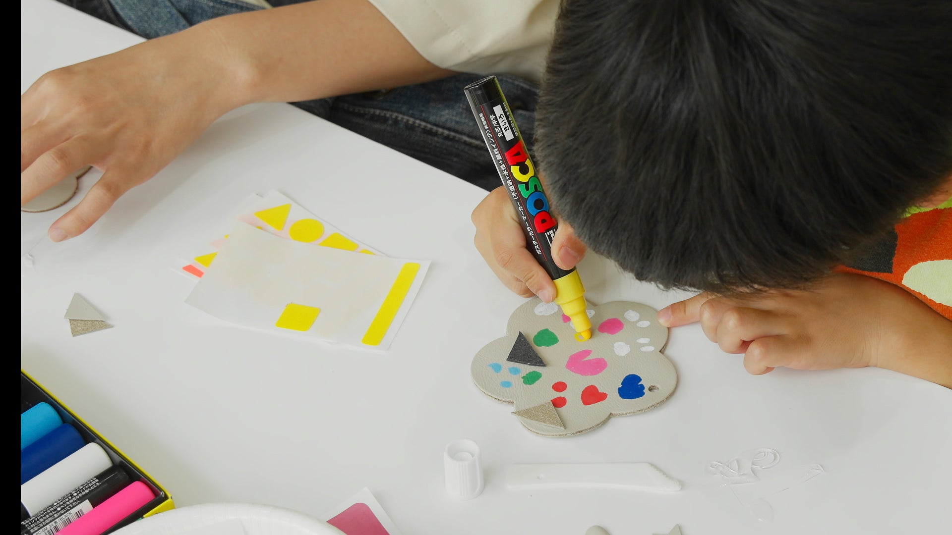 自動車の製造工程で発生するレザー端材から「アップサイクルキーホルダー」を作る工作体験です。捨てられるはずだったクルマ関連の素材を再利用することで、アップサイクルや環境のことを学びながら、カーボンニュートラルやSDGsについて考えるきっかけを提供します。4種類の形に型抜きされたパーツを使うため、ハサミを使わずに未就学のお子さまでもお楽しみいただけます。