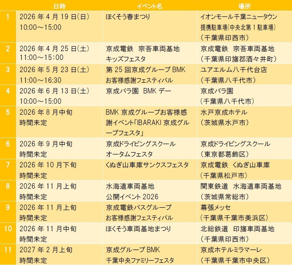 京成電鉄(本社:千葉県市川市、社長:天野 貴夫)をはじめとする京成グループでは、日頃からのご愛顧に感謝し、お客様とのふれあいを通じて京成ファンになっていただくべく、各社にて「京成グループBMKお客様感謝イベント2026」を開催します。