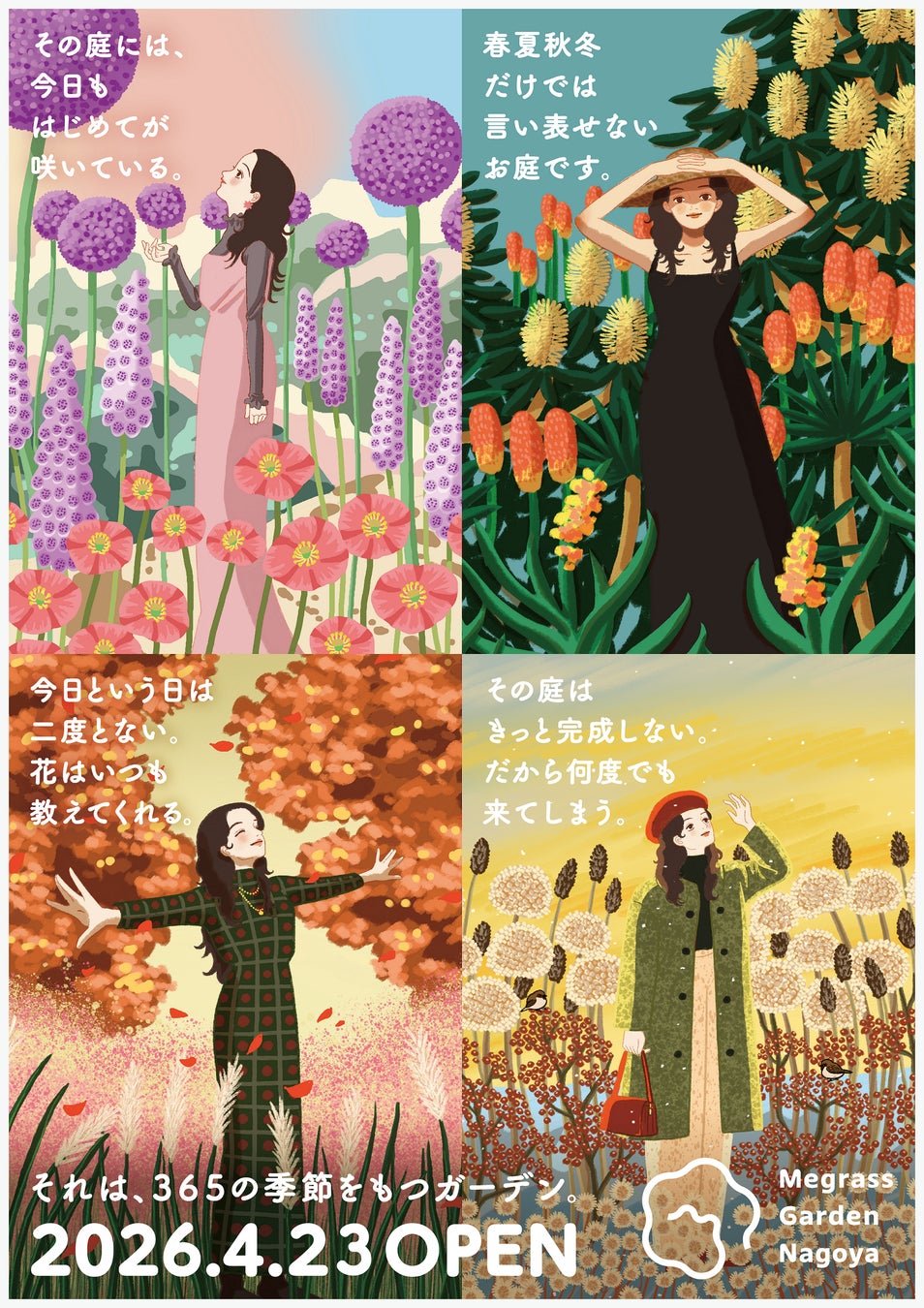 いつ訪れても草花たちの多彩な表情と出会えるという、メグラスガーデン ナゴヤが提供したい価値・世界観に基づき、「それは、365の季節をもつガーデン。」をプロモーション・コピーとして定め、谷さんにはコンセプトやプロモーション・コピーを表現するキービジュアルを描いていただきました。
