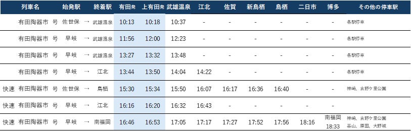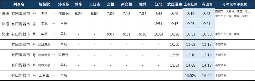 ●復路:有田・上有田→佐賀・鳥栖・博多(主な駅の時刻を掲載)