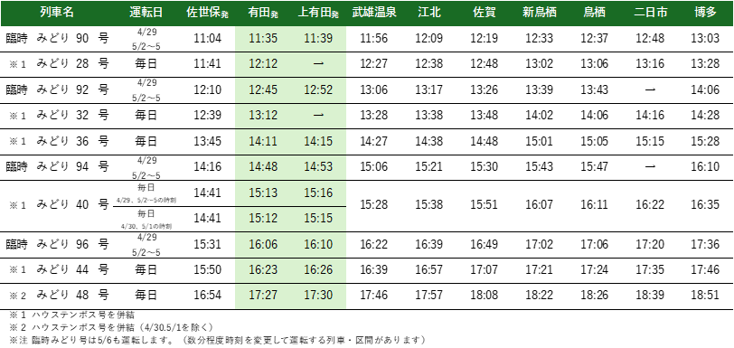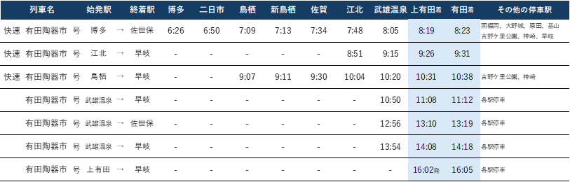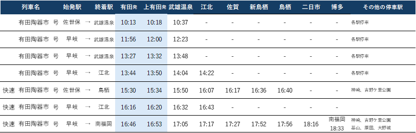 ●復路:有田・上有田→佐賀・鳥栖・博多(主な駅の時刻を掲載)