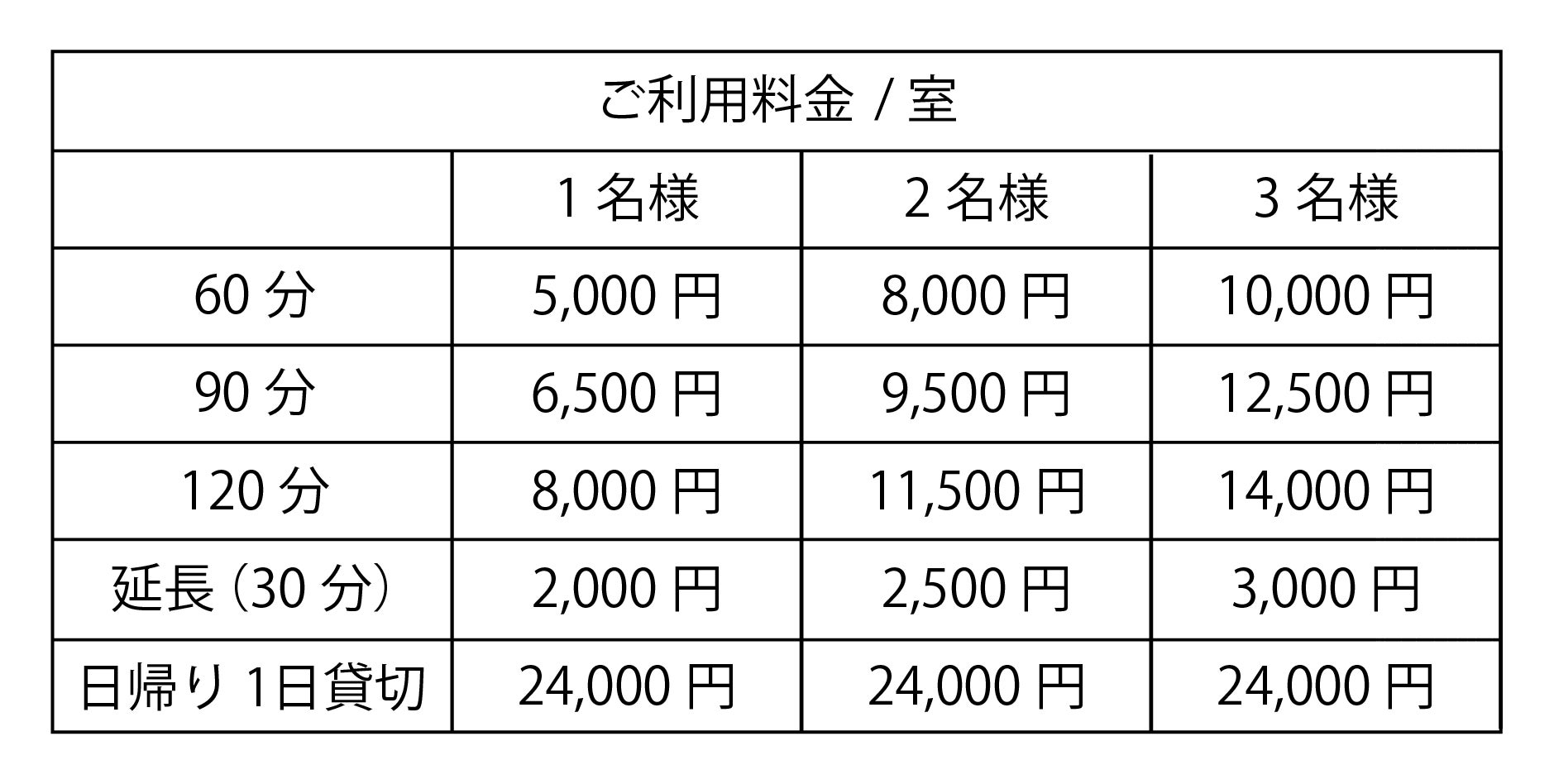 プライベートサウナのご利用時間は、60分・90分・120分の3タイプからお選びいただけます。