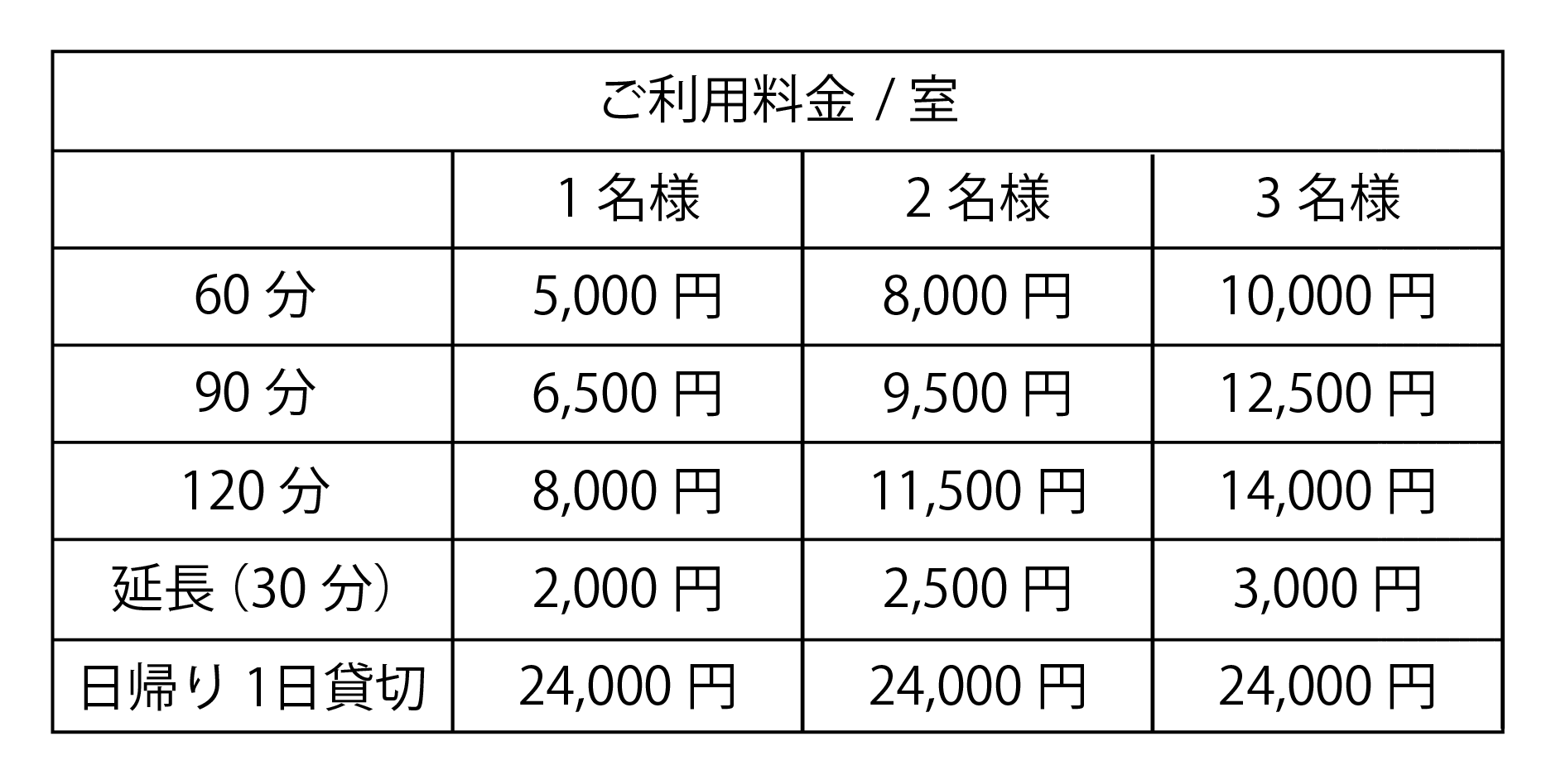 プライベートサウナのご利用時間は、60分・90分・120分の3タイプからお選びいただけます。