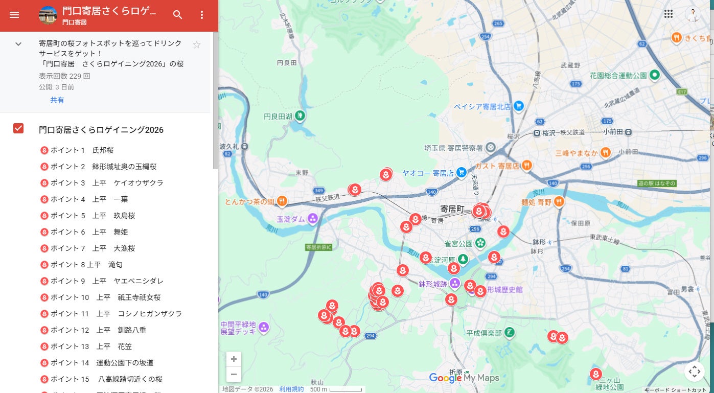 門口寄居では、Googleマップ上に桜が植えられている場所を示した地図を作成しました。50か所以上のポイントが示されています。