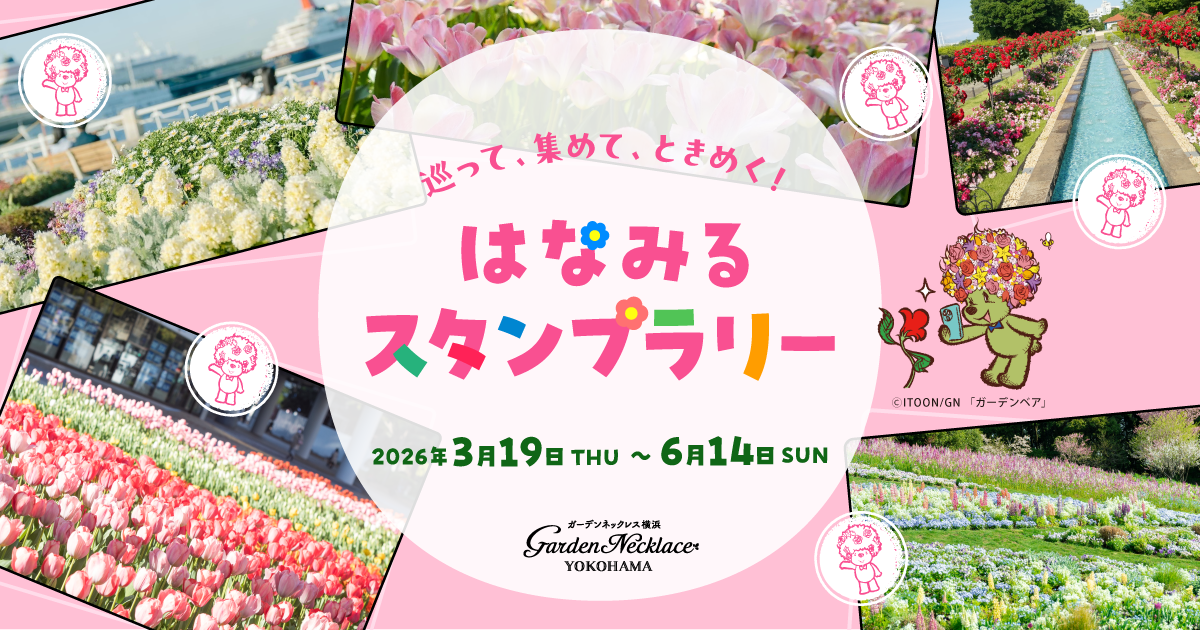 スタンプを集めた方には、ガーデンネックレス横浜のマスコットキャラクター「ガーデンベア」の限定デジタルステッカーをプレゼントほか、神奈川・横浜デスティネーションキャンペーン(DC)プレキャンペーン特別企画などの豪華賞品が当たる抽選への応募特典も用意しており、横浜の街を回遊しながら花と緑の魅力を再発見できる体験を提供いたします。