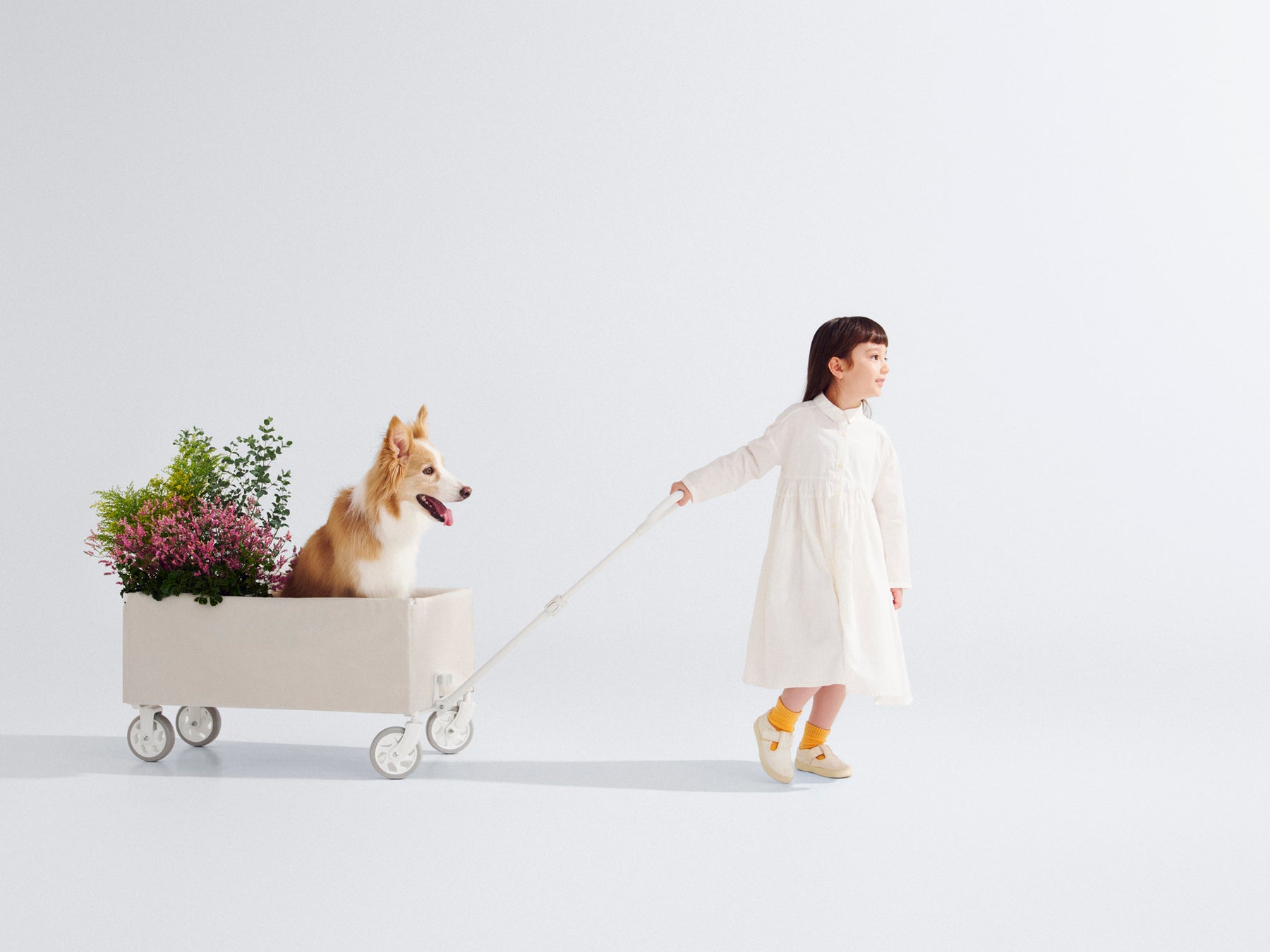 一般的なキャリーワゴンに見られる骨組みを、生地の内側に隠すことで、シンプルで美しい箱型の「スクエアフォルム」を実現しました。無骨なギア感を排除したデザインは、街中での買い物や公園への移動でも違和感なく、日常のあらゆるシーンにファッションのように馴染みます。