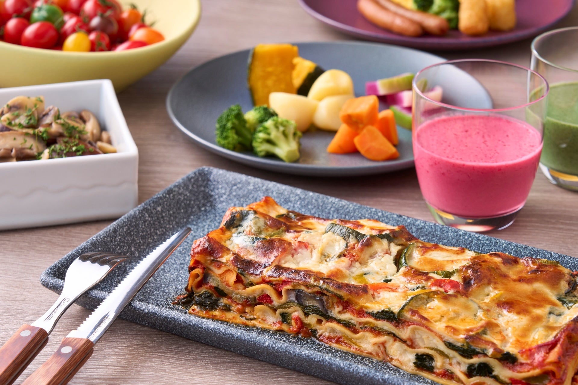 ベジタブルラザニアや温野菜、スムージーなど、ベジタブルメニューも豊富