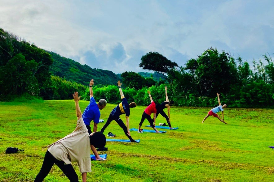 初心者でも安心して参加できるヨガ体験プログラム。太平洋を臨む自然に囲まれた芝生広場で、心地よい風や光を感じながら身体をゆっくりと整えます。朝の爽やかな時間にリフレッシュできる、心と身体を整えるウェルネス体験です。