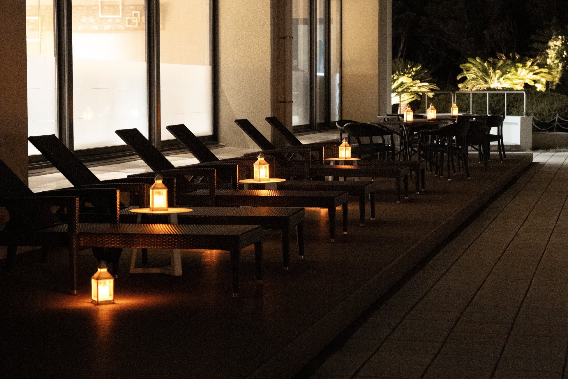 プールサイドにリラックスチェアとランタンを設置し、特別な夜のくつろぎ空間をご用意。心地よい夜風を感じながら、南房総の澄んだ夜空をゆったりと眺めることができます。ドリンクを片手に、大人のリラックスタイムにもおすすめのナイトスポットです。