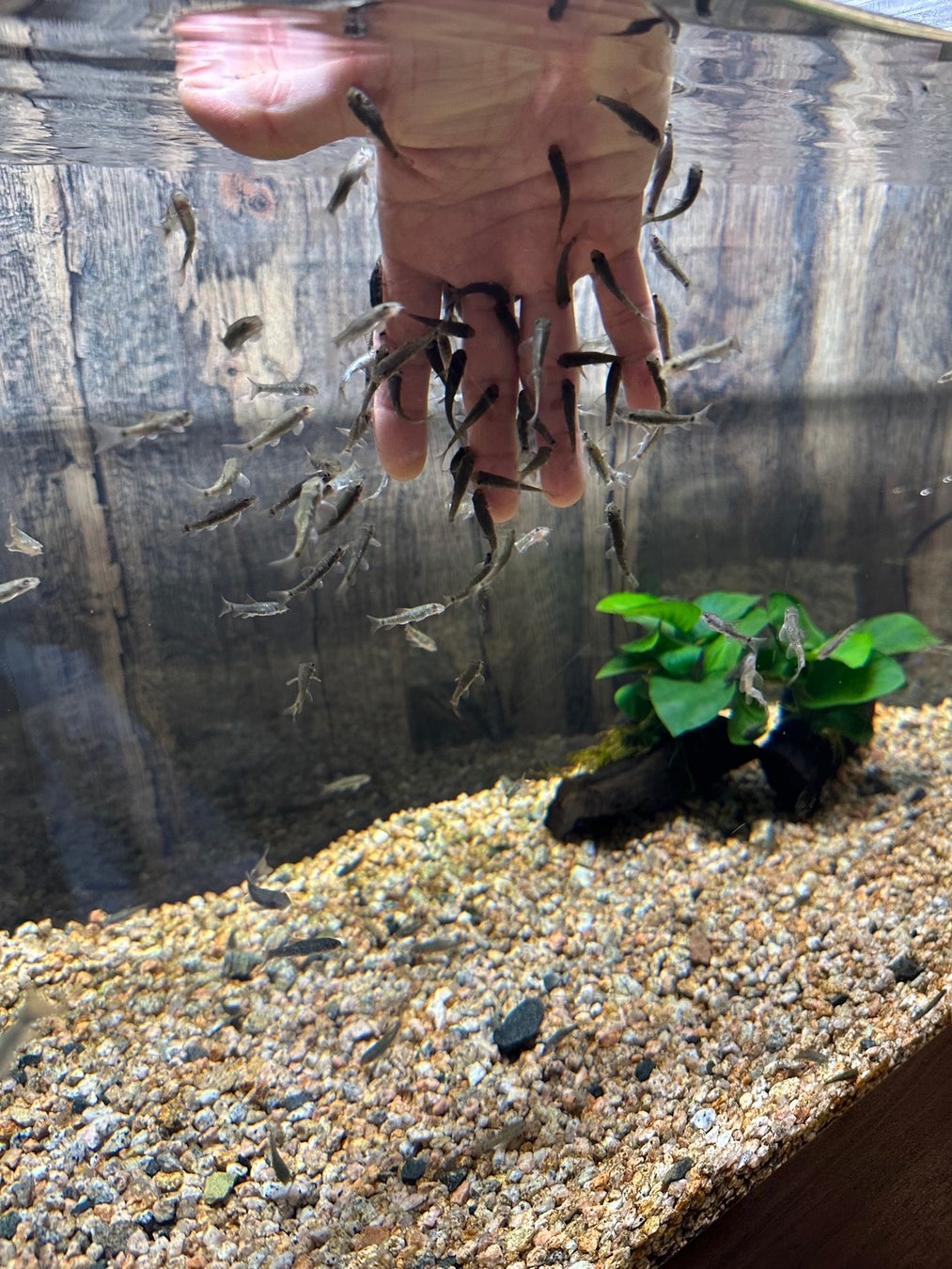 水槽に手を入れると、ガラ・ルファが周りに集まってきて、指や手の古い角質を優しくついばむ様子を観察することができます。最初はくすぐったいと感じられる方も多いですが、慣れて