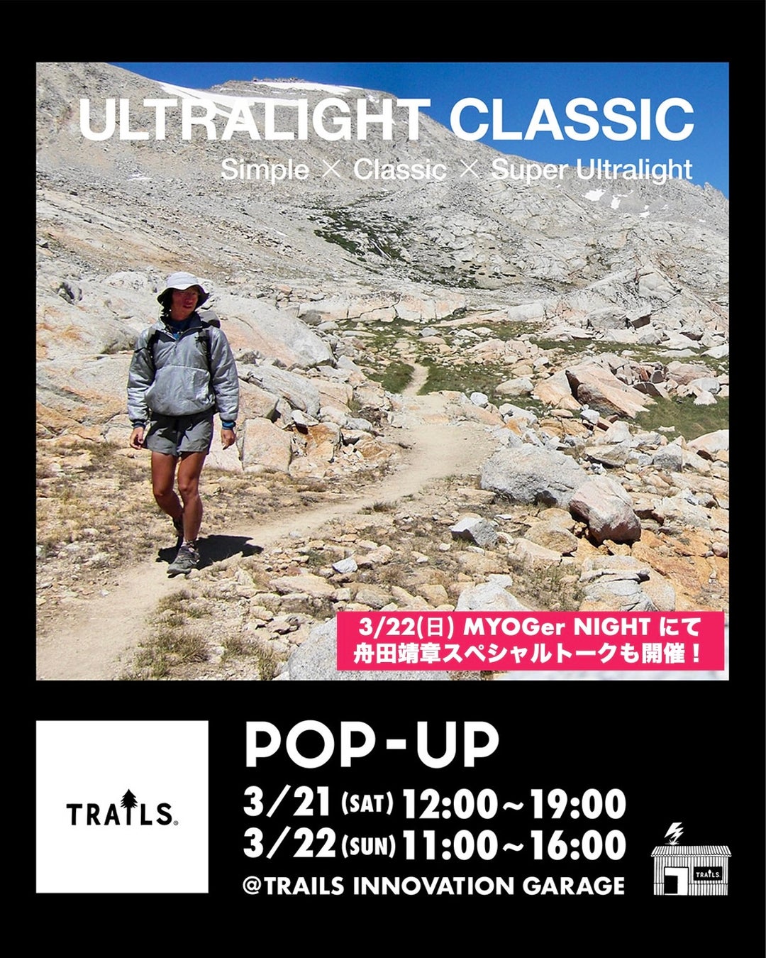 ULTRALIGHT CLASSIC Series”舟田靖章 MYOG KIT”のプレリリースとして、3月21日(土), 22日 (日)にTRAILS INNOVATION GARAGEにて、POP-UP「ULとMYOG展」の開催が決定。