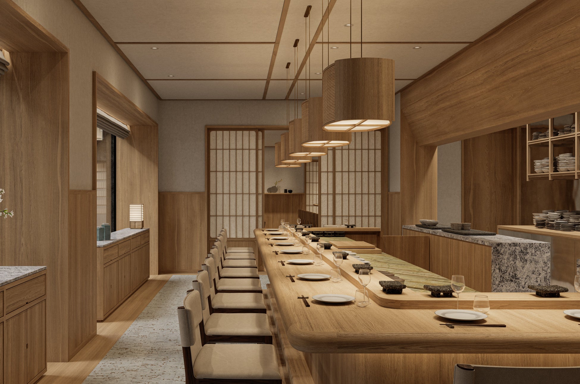 日没から夜へと移ろうひとときをテーマにした「宵」は、バーを主軸としたナイトダイニングです。地域の方々にも心地よくご利用いただける夜の新たな拠点として、周辺エリアでは希少なナイトタイムまでゆったりとお過ごしいただける空間で、本格的な和の味わいをお楽しみいただけます。元新道小学校の理科室等でかつて使用されていたペンダント照明や、音楽室の床材が巧みに再生された空間は、多くの人々が集い、交流を育んだ場所の歴史を継承し、そのレガシーを現代に再解釈しています。京都の社交文化を象徴する角屋に着想を得た、食・酒・会話が自然に交わる場を提供します。