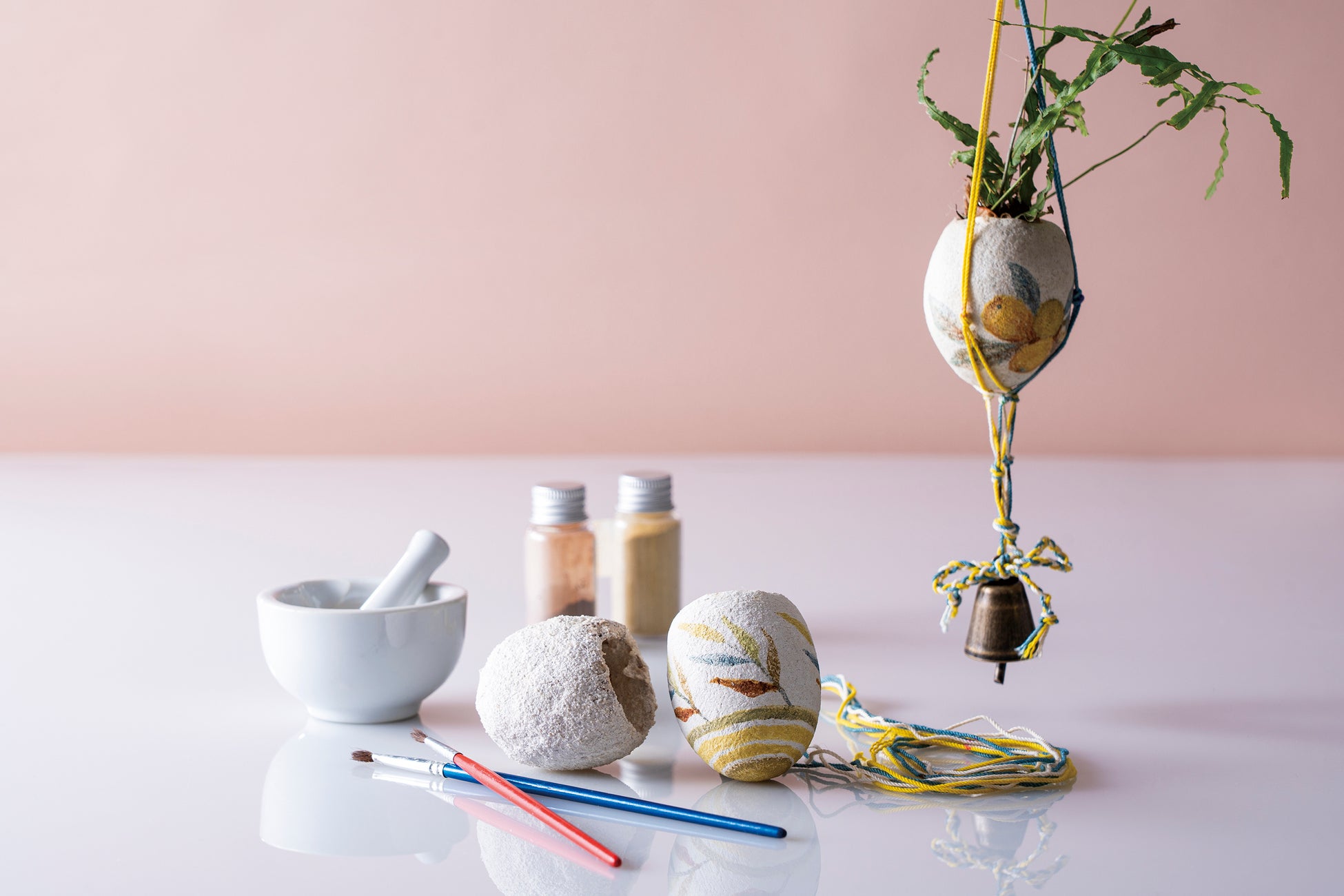 内容:植物アートのワークショップ。卵の殻に漆喰をまとわせた器に、植物から抽出した色を作って描き、網を編んで吊るします。器に植物を入れた完成品をお持ち帰りいただけます。