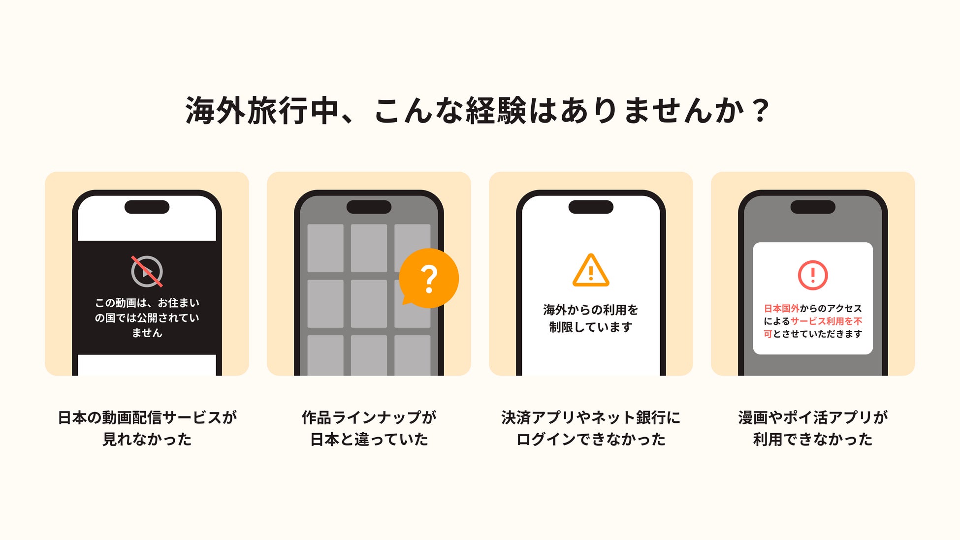 実は、多くの日本のアプリやWebサービスは海外からのアクセスに制限をかけています。普段使い慣れたサービスが突然使えなくなることは、海外旅行中の大きなストレスのひとつです。