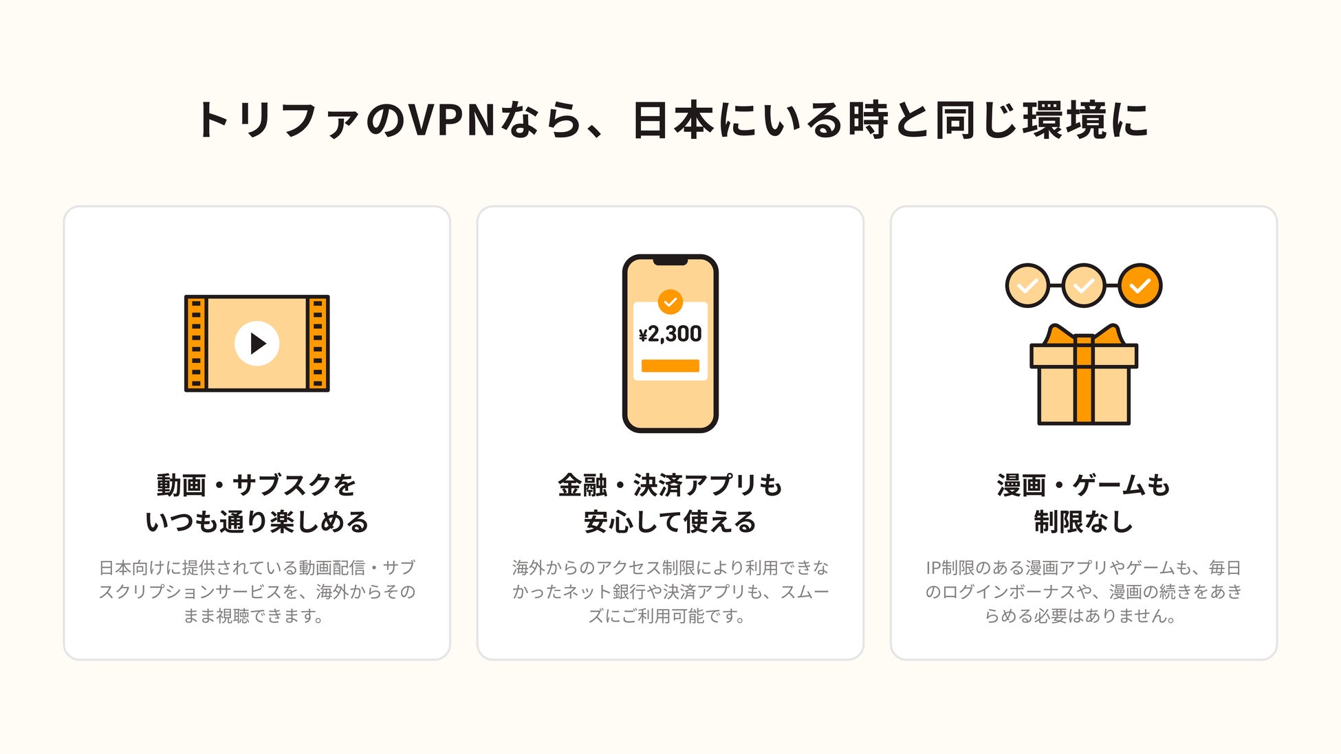 トリファのVPN機能を使えば、海外にいながら日本国内と同じようにアプリやサービスをご利用いただけます。旅先のホテルでいつもの動画を楽しんだり、日本の金融サービスに安心してアクセスしたり。海外に着いた瞬間から、いつものスマホ体験をそのままお届けします。