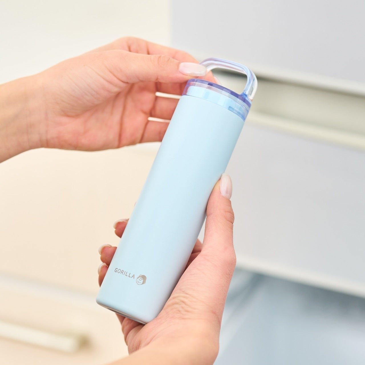 外側のホルダーは真空二重構造を採用しました。冷たさが持続しやすく、結露しにくいためバッグに入れて持ち運びやすい構造です。