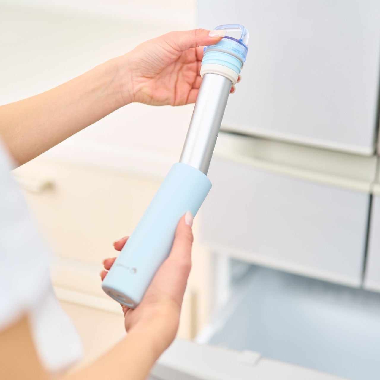 外側のホルダーは真空二重構造を採用しました。冷たさが持続しやすく、結露しにくいためバッグに入れて持ち運びやすい構造です。