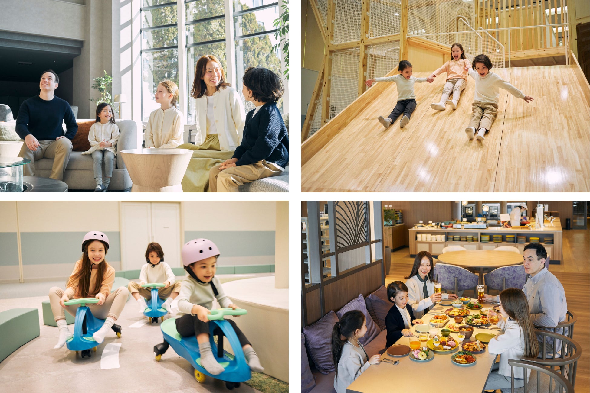 朝夕のビュッフェスタイルの食事、アルコールやソフトドリンクが楽しめるラウンジ、温泉露天風呂やサウナを備えた大浴場など、お子さまの「楽しい」だけでなく、大人も日常を離れ心ほどけるひとときが過ごせるサービスでお客さまをお迎えします。