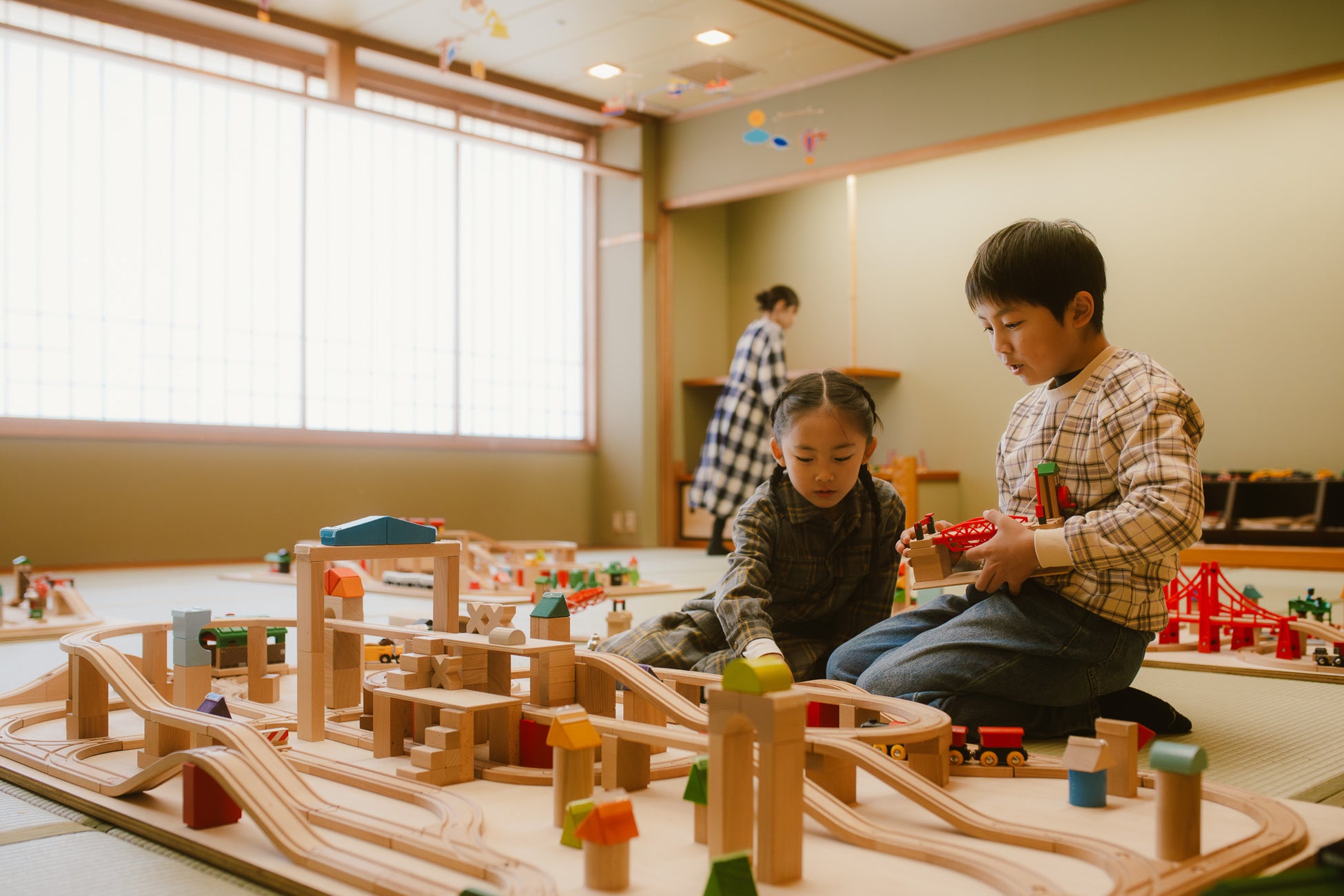 「森のラウンジ」の向かい側には、3つの遊び場を用意しています。おもちゃのピアノや鉄琴を備えた「サウンドルーム」、木のレールを繋ぎ合わせて列車を走らせ、自分だけの街を作ることができる「トレインルーム」では、独創力や発想力を存分に発揮して楽しむことができます。