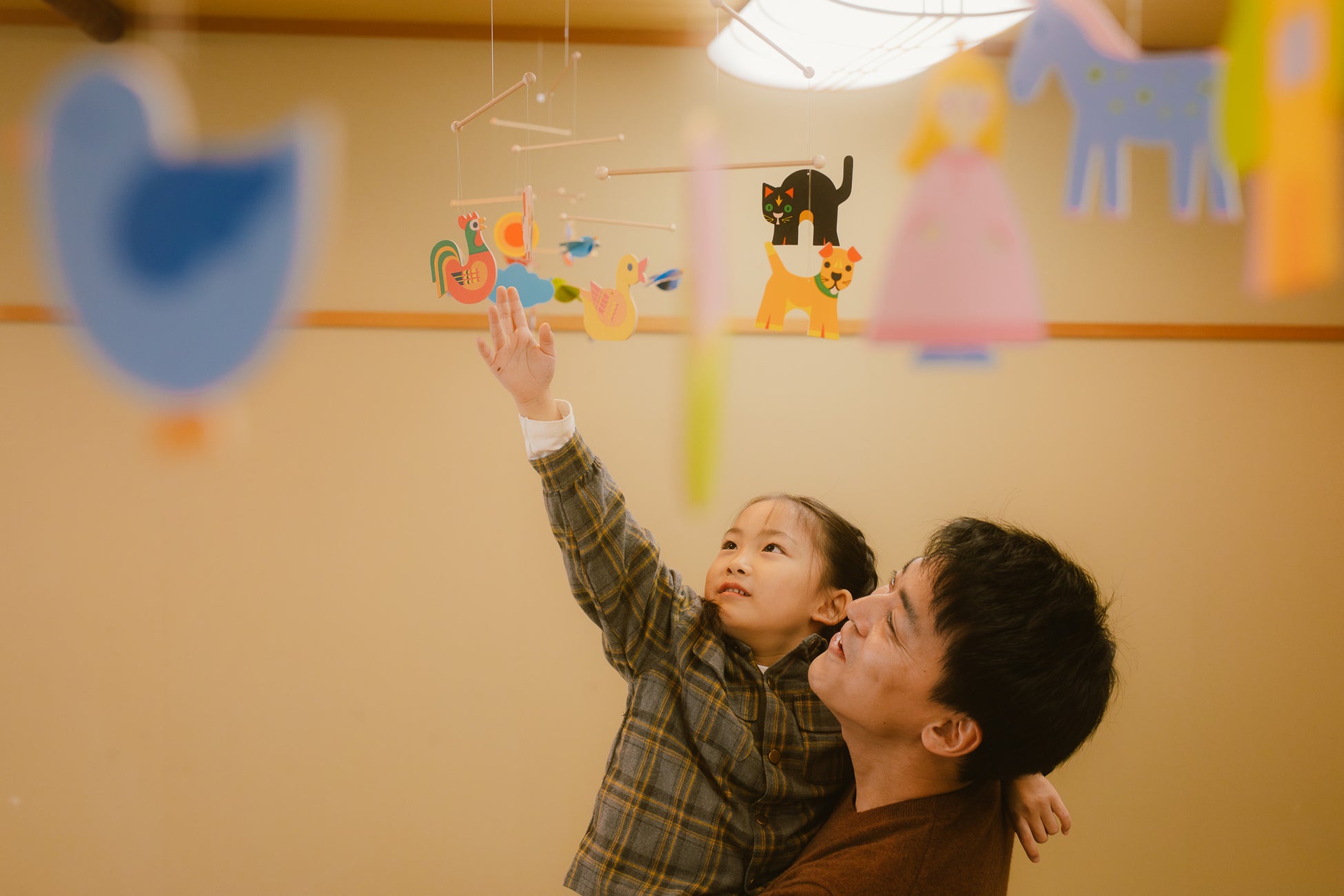 天井から可愛らしいデザインのモビールがぶら下がる空間は、落ち着いた色合い、木を使った遊具が多く、大人もほっとできる空間です。
