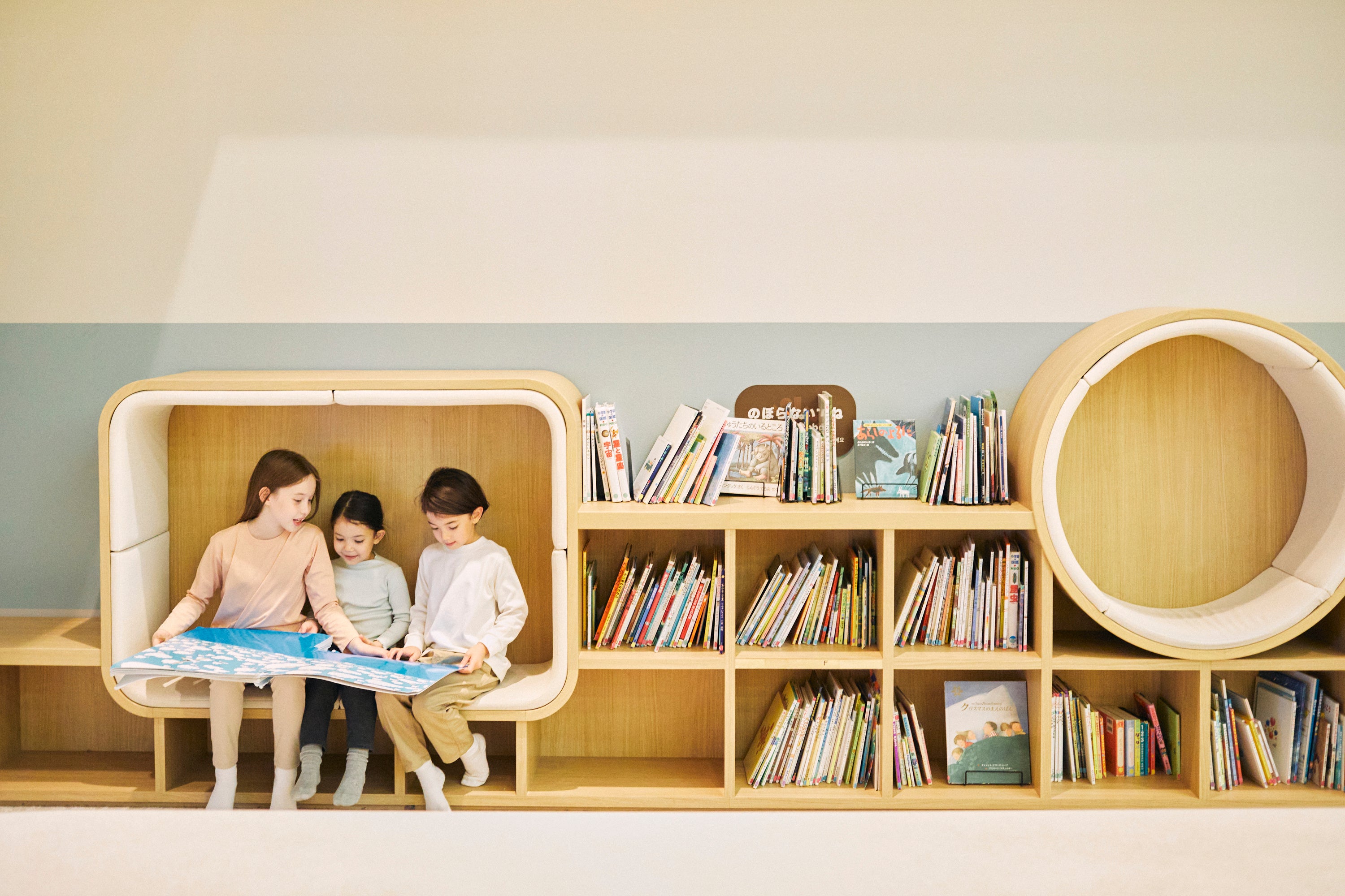 アクティブな遊び体験だけでなく、思わず手に取りたくなる絵本が並ぶ本棚や、0~6歳児が遊べるスペースも用意しているので、お子さまの年齢や好みに合わせて、自由に楽しむことができます。