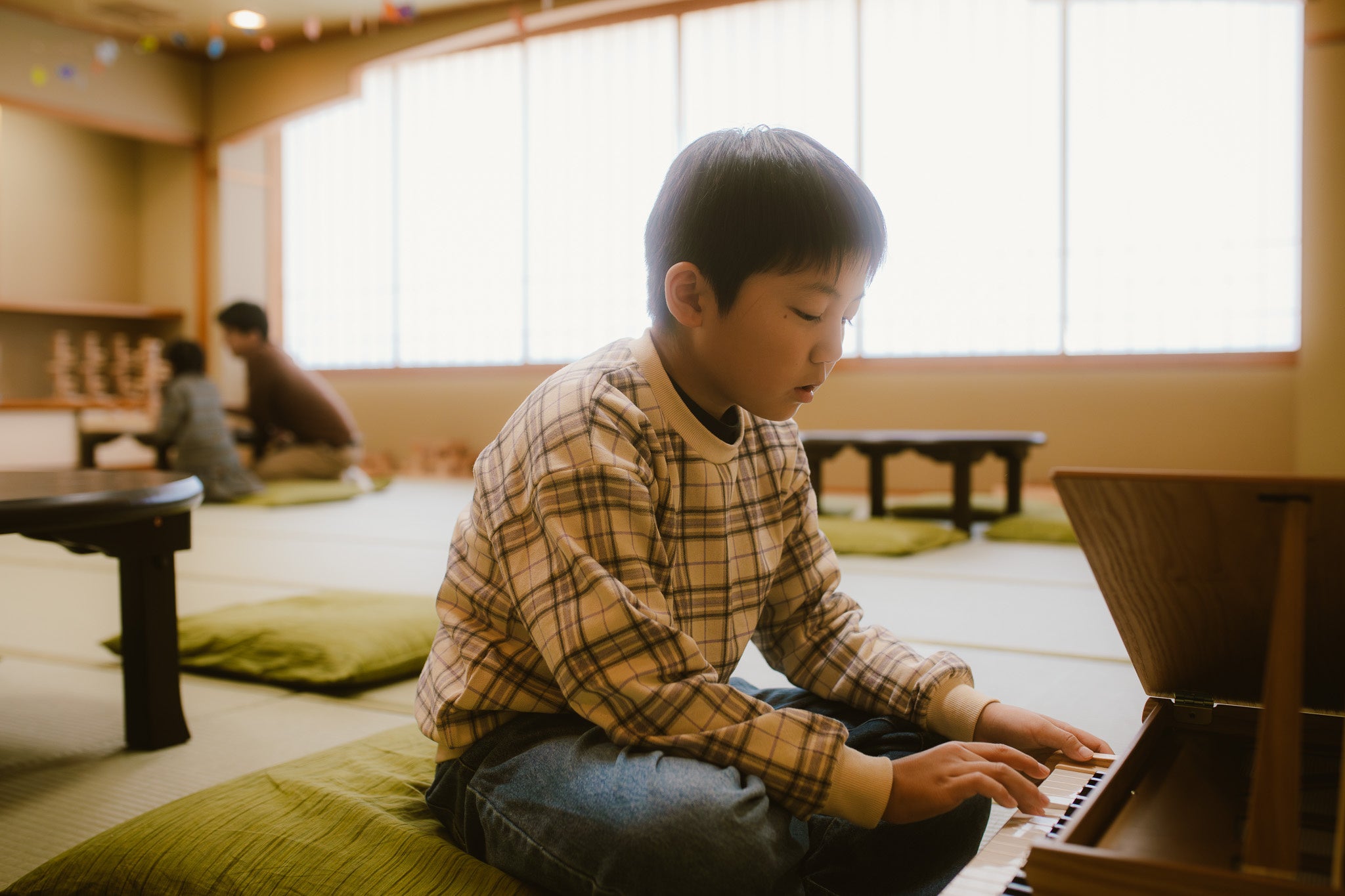 「森のラウンジ」の向かい側には、3つの遊び場を用意しています。おもちゃのピアノや鉄琴を備えた「サウンドルーム」、木のレールを繋ぎ合わせて列車を走らせ、自分だけの街を作ることができる「トレインルーム」では、独創力や発想力を存分に発揮して楽しむことができます。