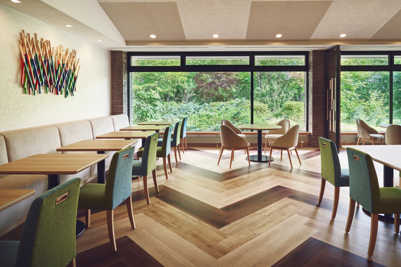 大きな窓から森の緑が広がる、自然に包まれた広々とした”フォッジ フォレスト ダイニング”。