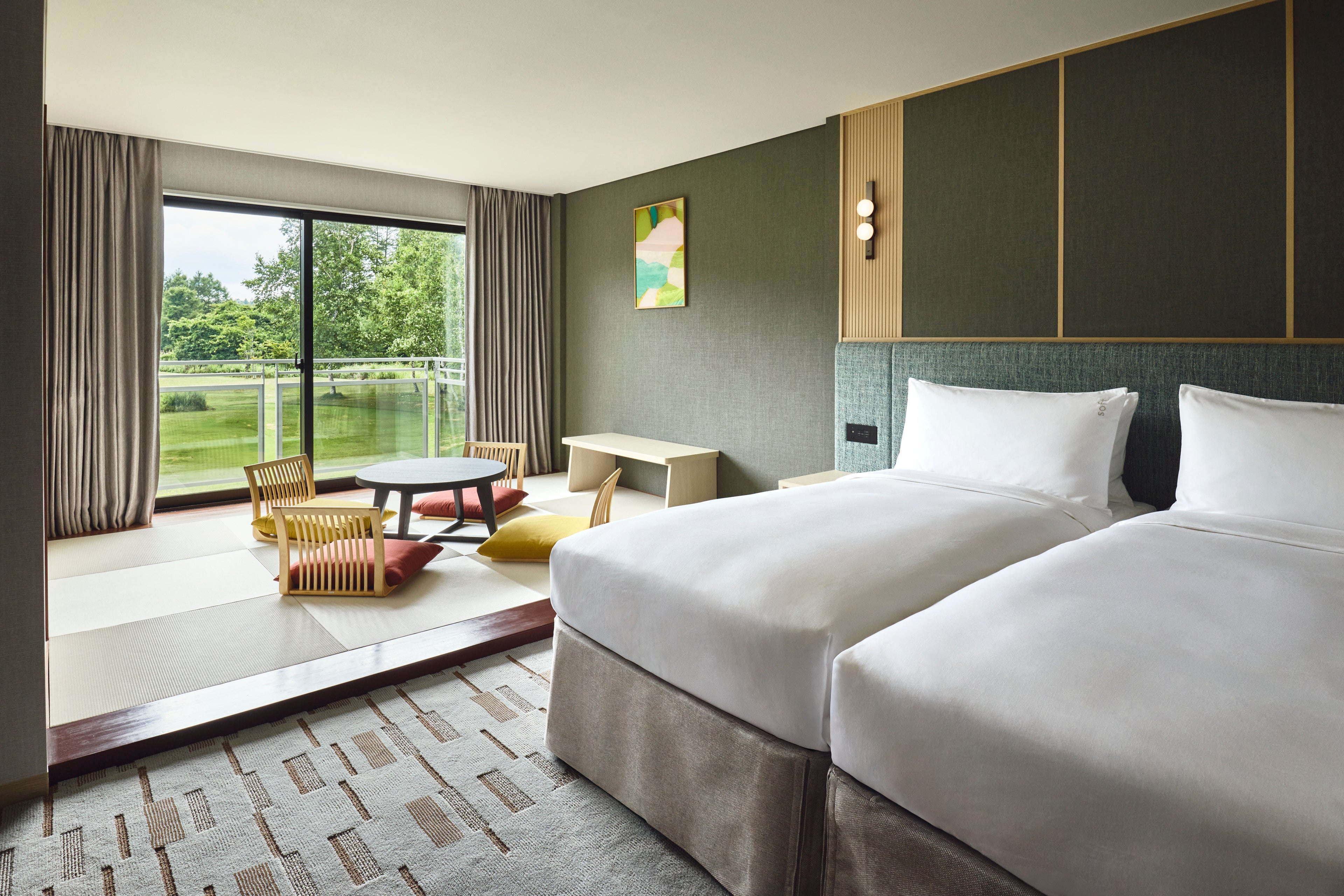 客室は広々とした洋室を中心に、ファミリーに便利なコネクティングルームや、四季折々の自然を望む眺望タイプなど、多様なスタイルをご用意。全室禁煙・Wi-Fi完備の快適な空間で、落ち着いたインテリアとゆったりとしたベッドが寛ぎのステイを演出します。