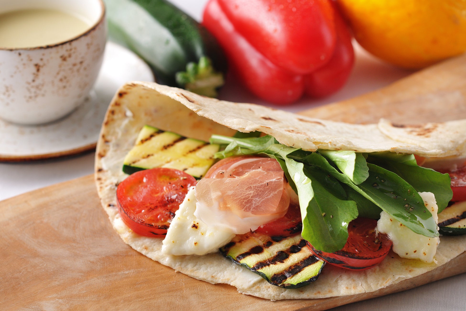 *4 イタリアのロマーニャ地方の郷土料理。薄く焼いた生地に具材を挟んで食べる料理