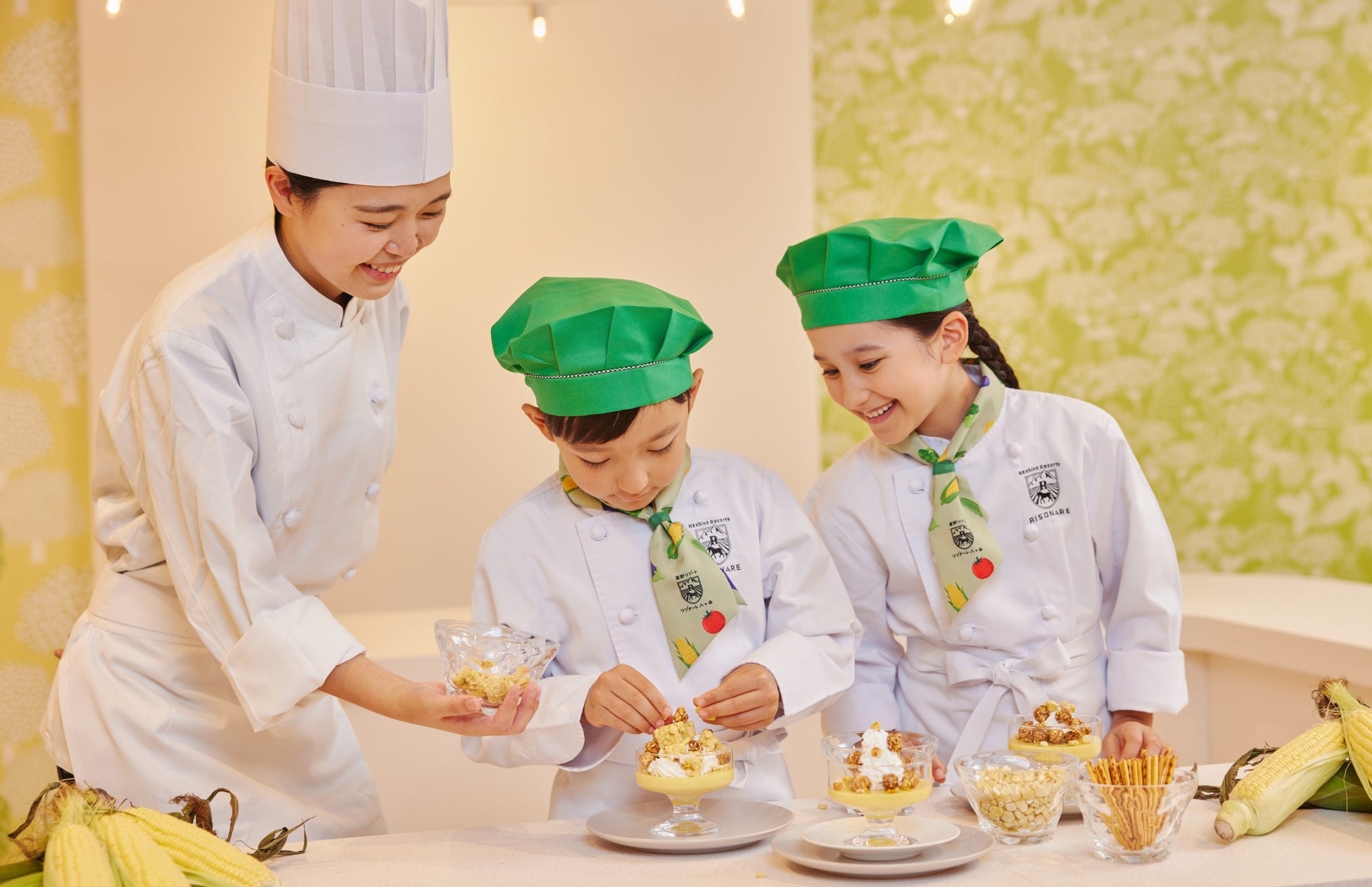 リゾナーレキッズスタジオでは、規格外品の野菜について楽しく学んで作る「サステナブルキッズスタジオ」を開催します。「規格外品の野菜とはどんな野菜か」や「販売できない野菜はどうなるのか」などを学んだ後、規格外品のとうもろこしを使用した「とうもろこしのプリン」に、クリームを絞ったり、ポップコーンをのせたりして自分好みのトッピングを楽しめます。規格外品でも美味しく食べられることを楽しく学べるプログラムです。