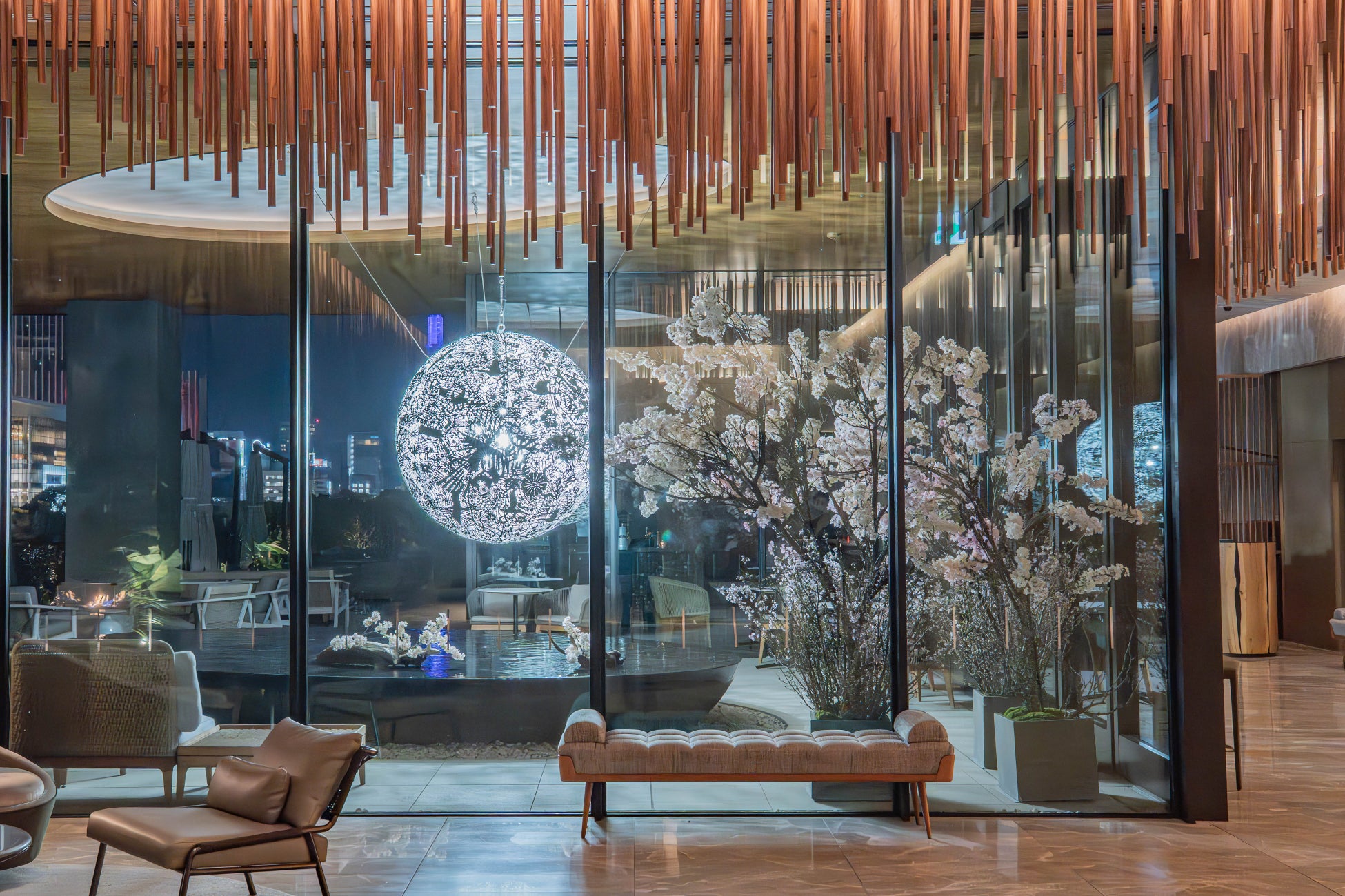 ことしもTIAD5階の水盤テラスに桜の装飾がお目見えいたしました。テラスはパブリックスペースですので、どなた様も桜をご覧いただけます。また、隣接するオールデイダイニングのテラス席やバーカウンターからも桜を愛でることができ、ロゼワインフェア、ピエール・エルメ・パリ「ショートケーキ イスパハン」ご提供期間とも重なりますので、お花見気分でお食事やドリンクをお愉しみいただけます。