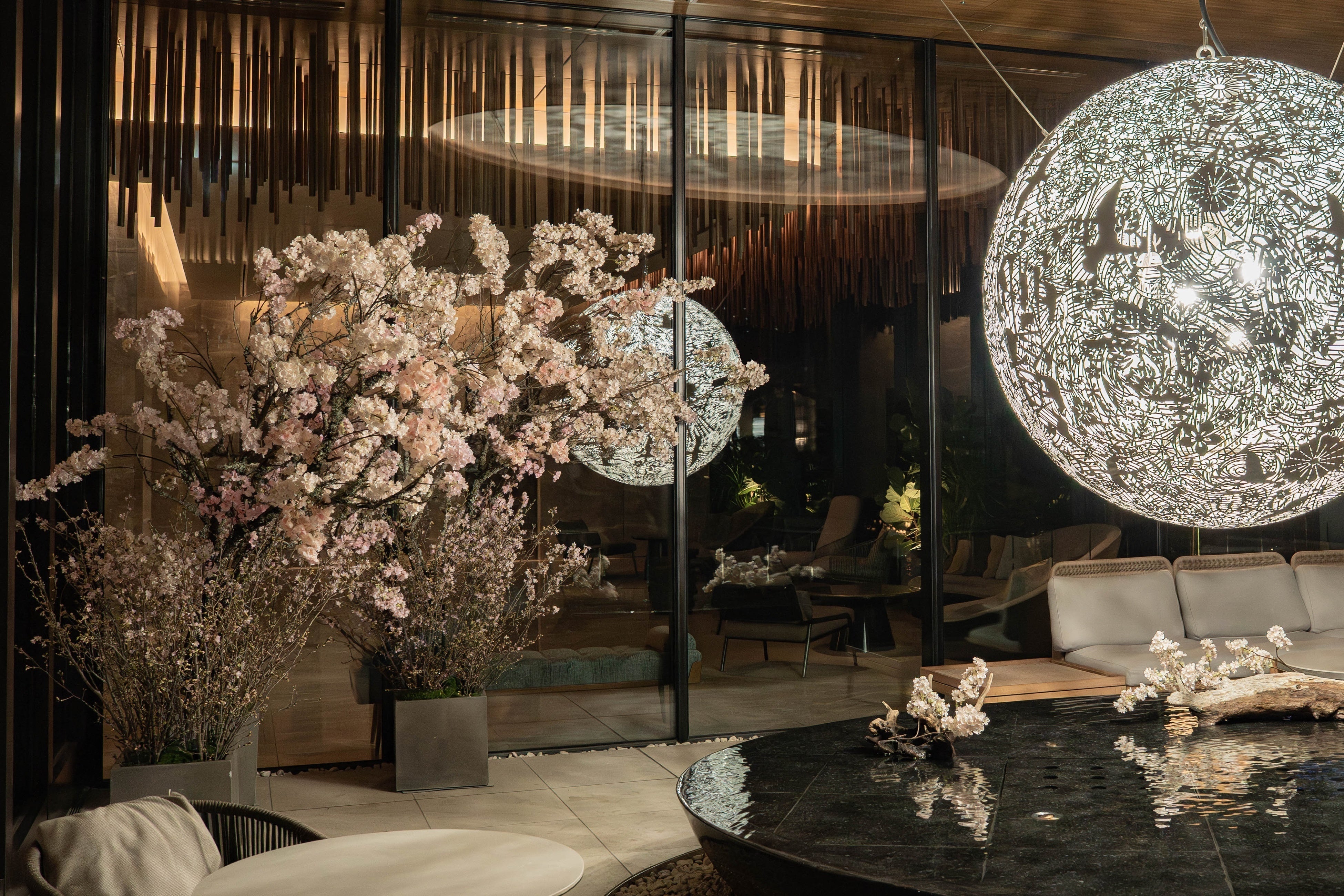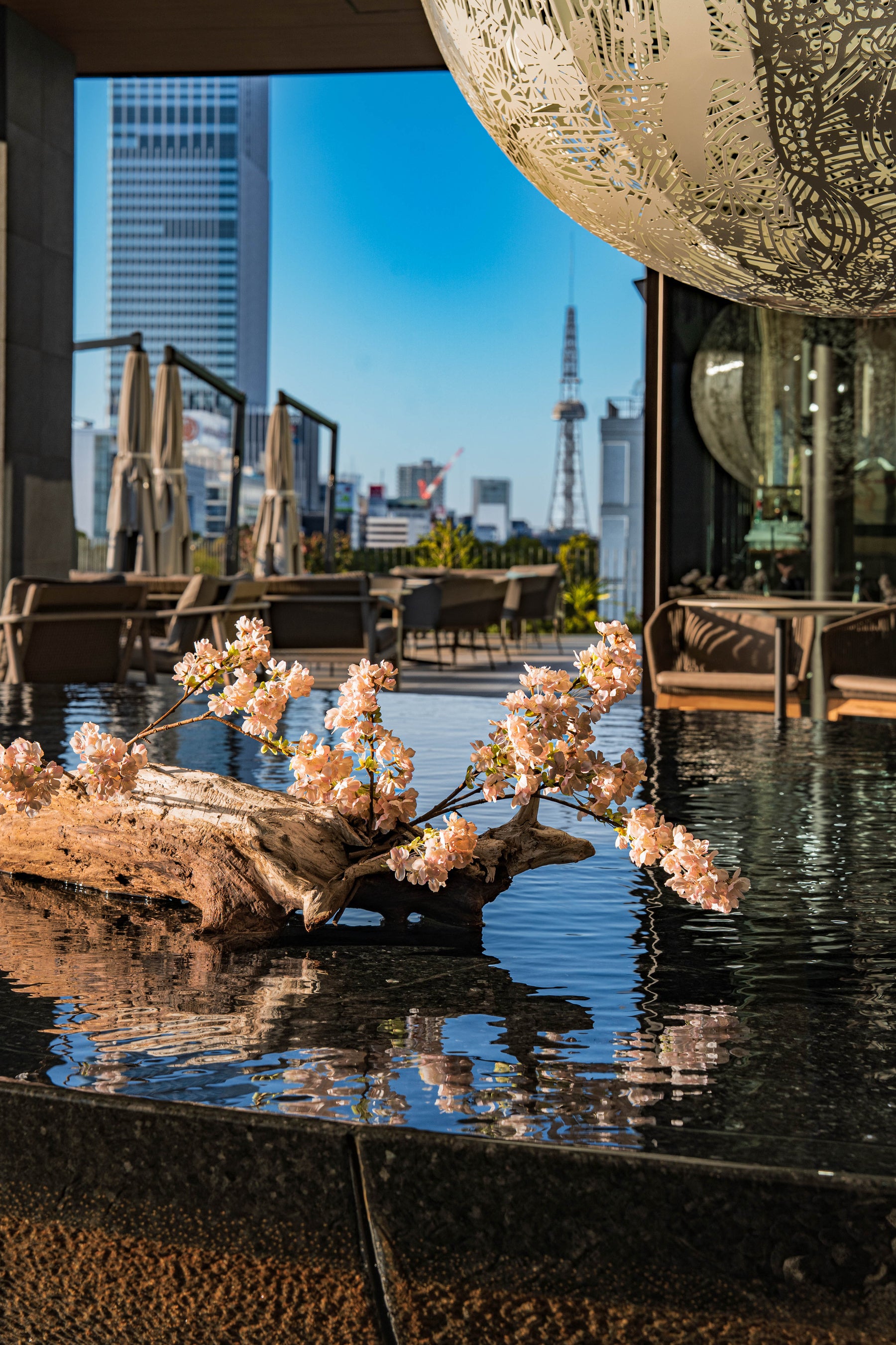 ことしもTIAD5階の水盤テラスに桜の装飾がお目見えいたしました。テラスはパブリックスペースですので、どなた様も桜をご覧いただけます。また、隣接するオールデイダイニングのテラス席やバーカウンターからも桜を愛でることができ、ロゼワインフェア、ピエール・エルメ・パリ「ショートケーキ イスパハン」ご提供期間とも重なりますので、お花見気分でお食事やドリンクをお愉しみいただけます。